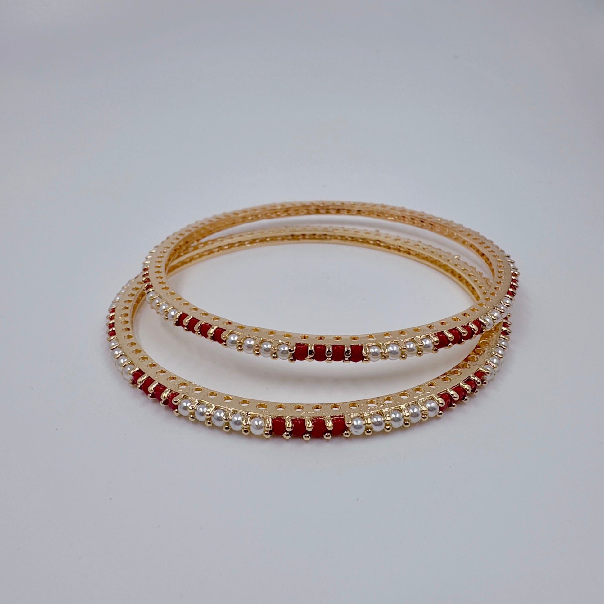 As an industry expert, I present the elegant Red and White Pearl Bangles. These high-quality bangles showcase a stunning combination of red and white pearls, adding a touch of sophistication and luxury to any outfit. Made with precision and care, they are perfect for special occasions or adding a touch of glamour to any day.