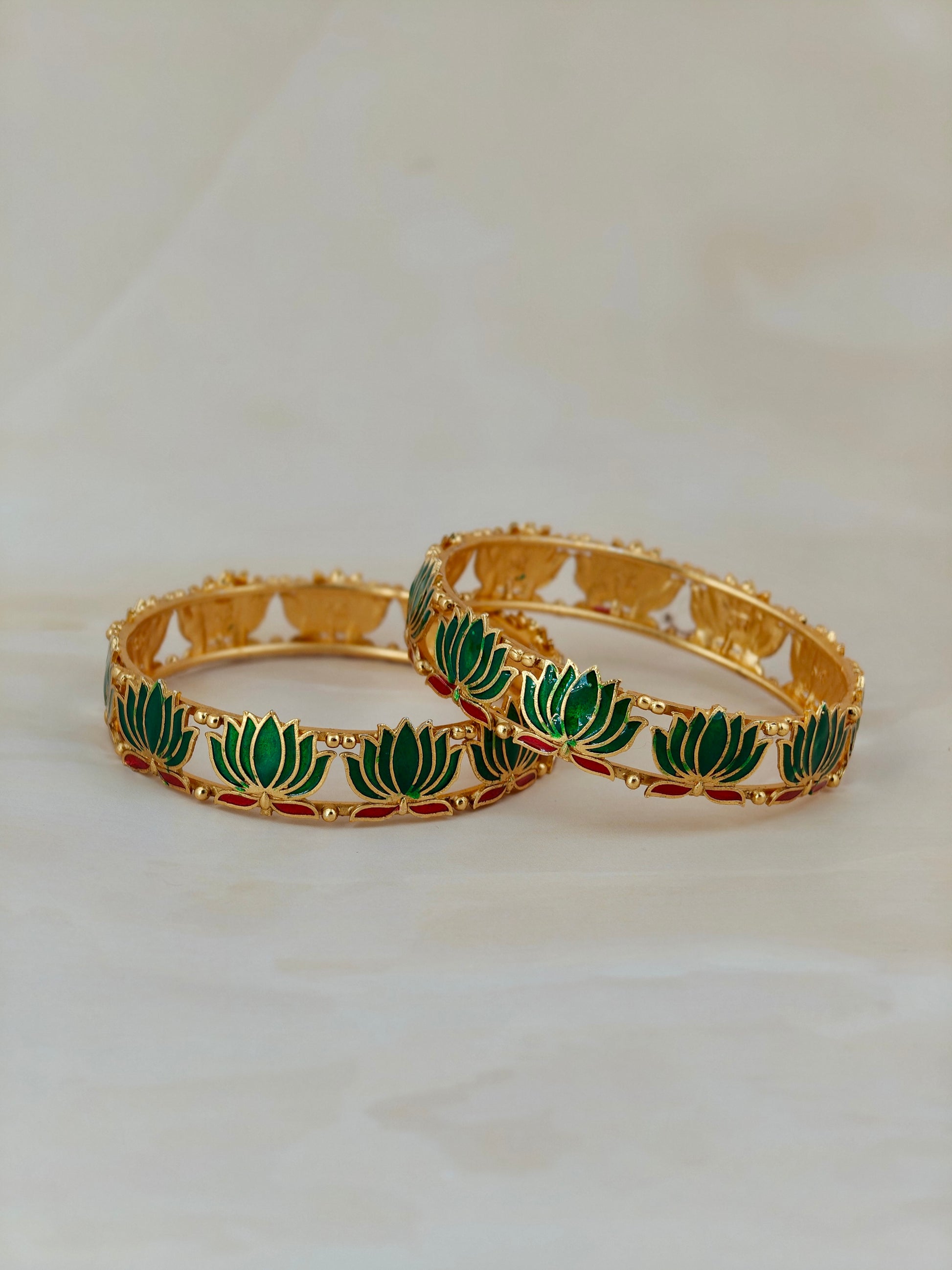 Elevate your accessory collection with the Trending Lotus Bangle in Green. Expertly crafted, this bangle features a delicate lotus motif symbolizing purity and renewal. Its vibrant green hue adds a refreshing touch to any outfit, making it ideal for both casual and formal occasions. Designed for comfort and style, this piece offers a timeless elegance that complements diverse wardrobes.