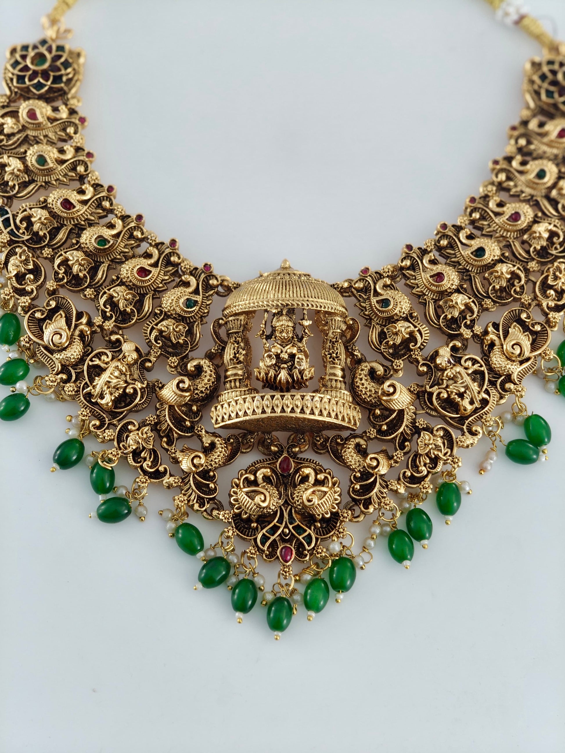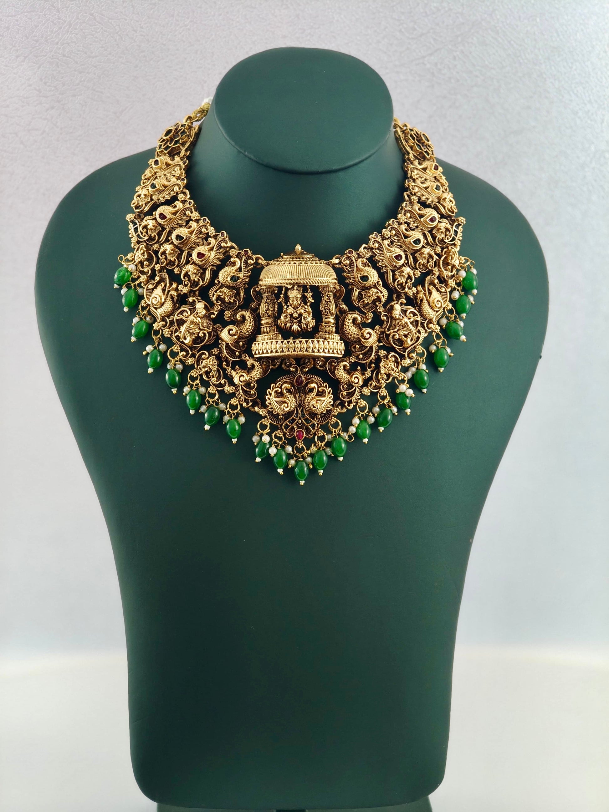 Temple Bridal Set with Green Beads Elevate your bridal ensemble with this exquisite temple jewelry set, meticulously crafted to complement traditional wedding attire. Featuring lustrous green beads intricately arranged in classic temple designs, this set captures the essence of timeless bridal elegance. Each piece is thoughtfully designed to enhance your natural beauty while honoring cultural heritage. Perfect for weddings, festivals, and special celebrations, this versatile set offers the sophistication and grace expected of premium bridal jewelry. The harmonious blend of traditional craftsmanship and refined aesthetics makes it an essential addition to your wedding day collection.
