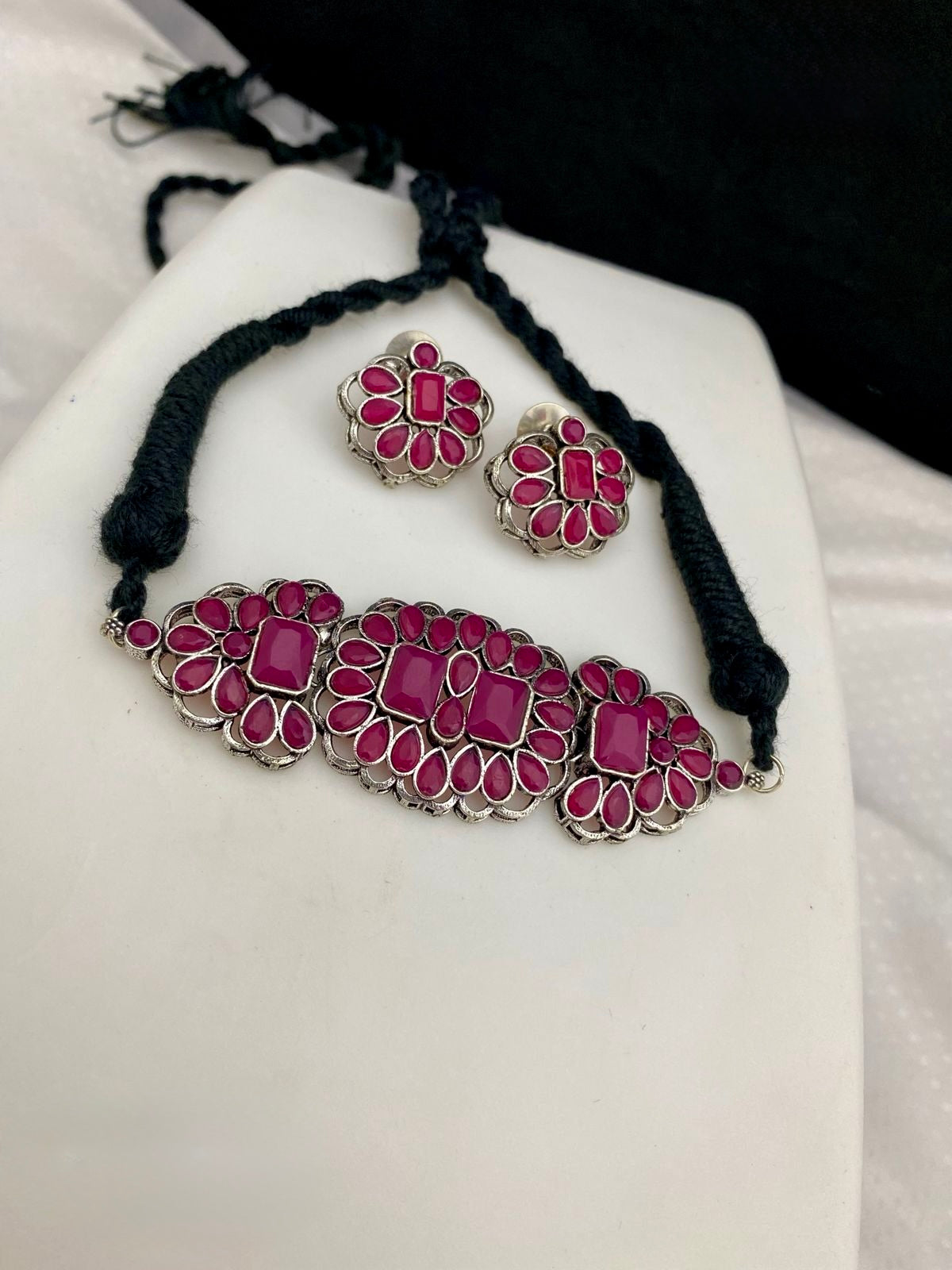 Elevate your ensemble with the Oxidised Magenta Stone Choker, a finely crafted statement piece that blends vintage charm with contemporary edge. The deep magenta stones set in oxidised metal provide a rich contrast, highlighting intricate detailing that enhances its artisanal appeal. This choker offers both versatility and sophistication, perfect for adding a distinctive accent to formal and casual wear alike. Durable yet lightweight, it ensures comfortable daily wear while maintaining its striking look. Ideal for those who appreciate expertly crafted jewelry with timeless character.