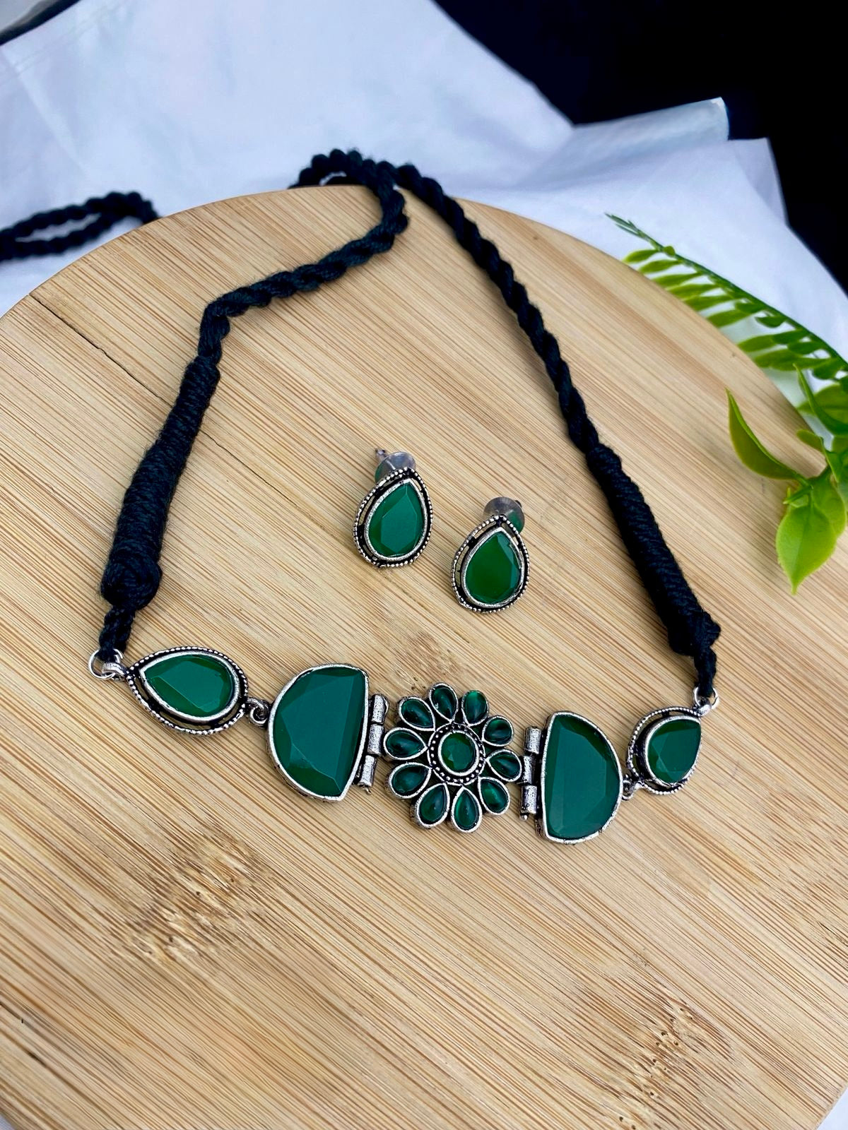 This oxidised choker combines traditional metalwork with a black thread base, accented by striking green stones for a bold yet elegant look. The oxidised finish enhances the intricate design, while the black thread offers comfort and adjustability. Ideal for elevating both casual and formal attire, this piece balances durability with refined craftsmanship, making it a versatile addition to your jewelry collection.