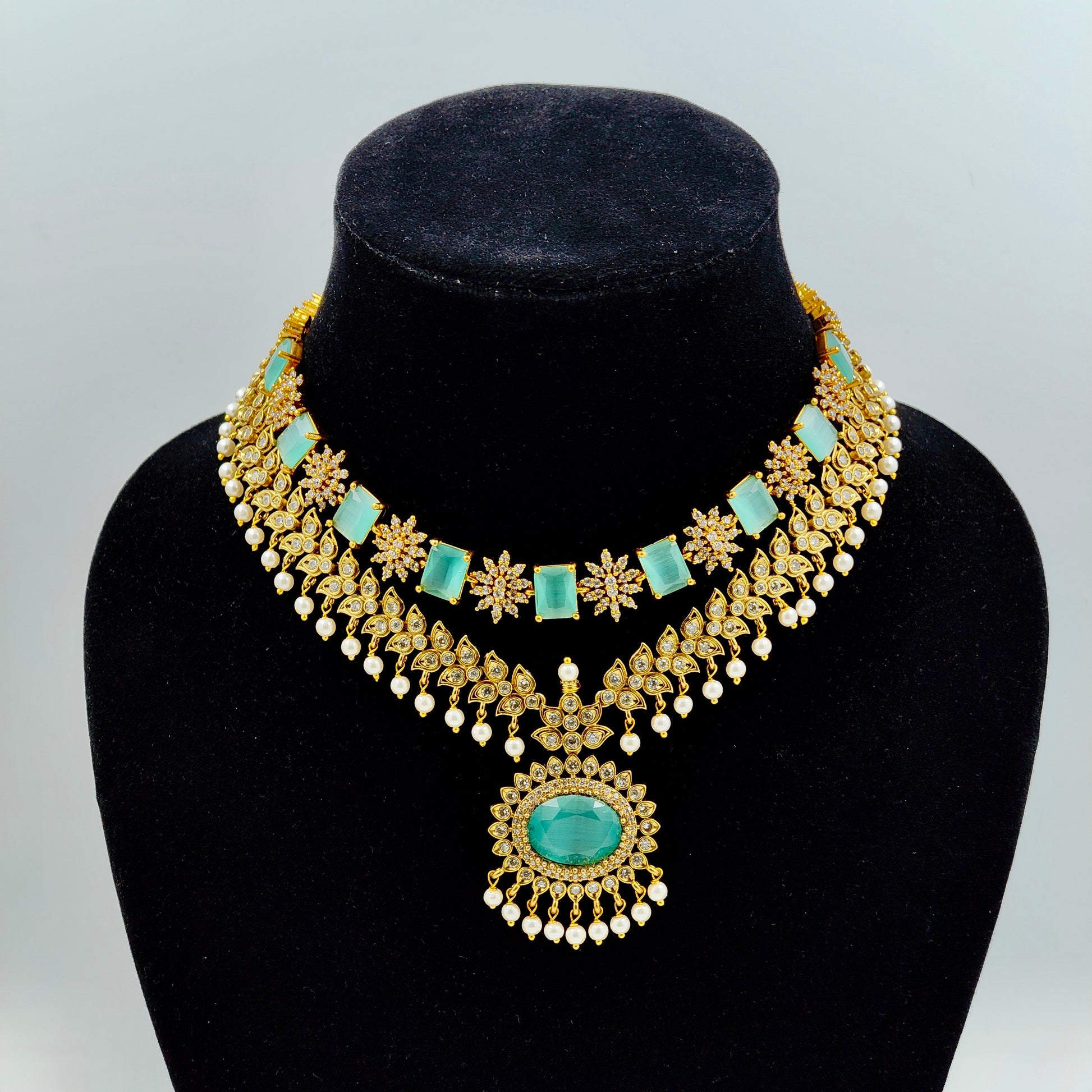 Elevate your bridal look with our trending Bridal Choker Combo. Combining two chokers into one piece, this accessory will add a touch of elegance and sophistication to any wedding ensemble. With its unique design, it's sure to make a statement on your special day. Upgrade your style with this must-have accessory.