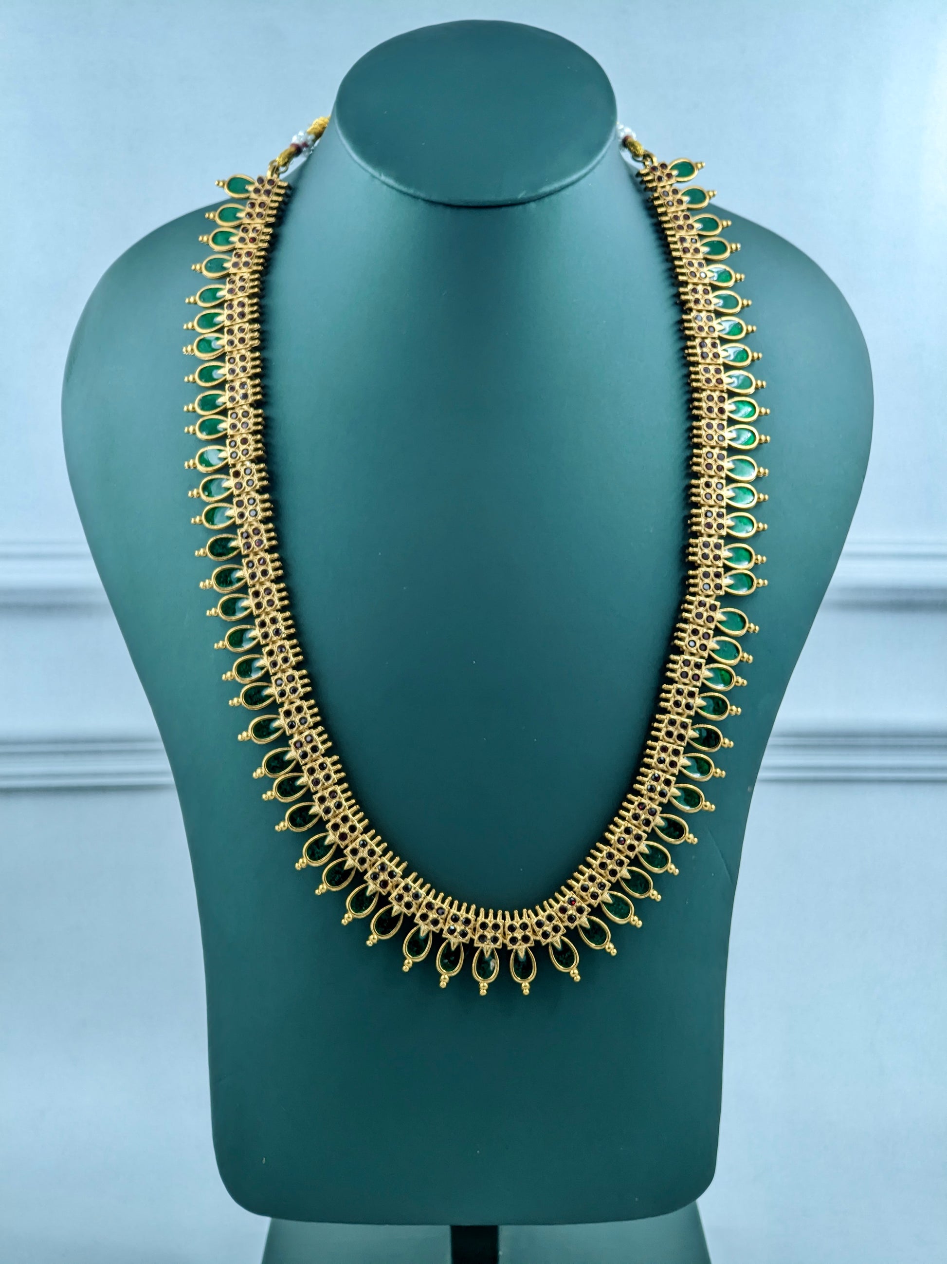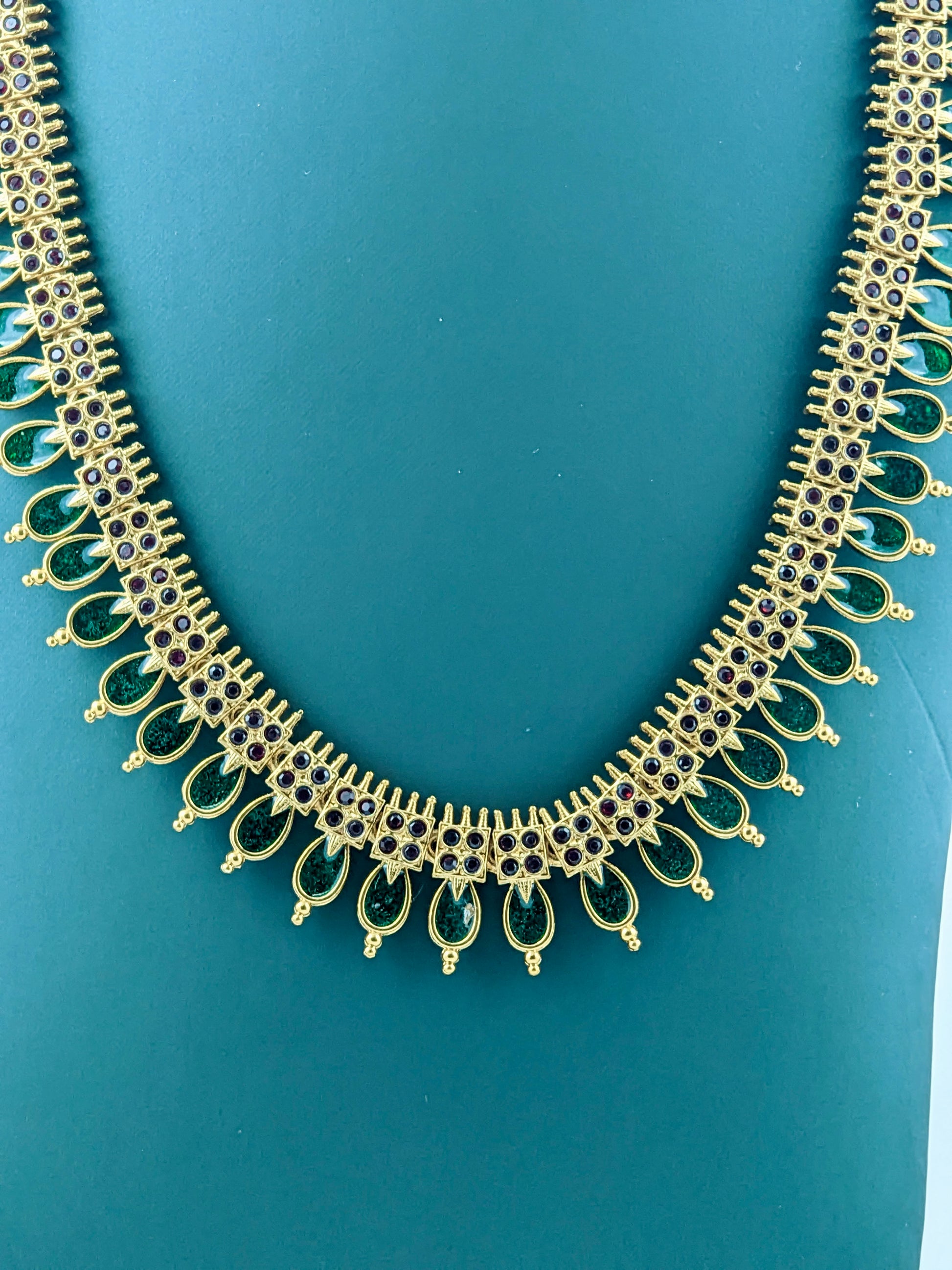 The Beautiful Traditional Nagapadam Haaram showcases exquisite craftsmanship with its intricate design inspired by classic South Indian jewelry. This elegant piece features detailed Nagapadam motifs, symbolizing protection and prosperity, making it a meaningful addition to your collection. Perfect for special occasions, it enhances traditional attire with timeless charm and sophistication. Crafted to offer both durability and grace, this haaram is an expert choice for those seeking authentic cultural elegance.