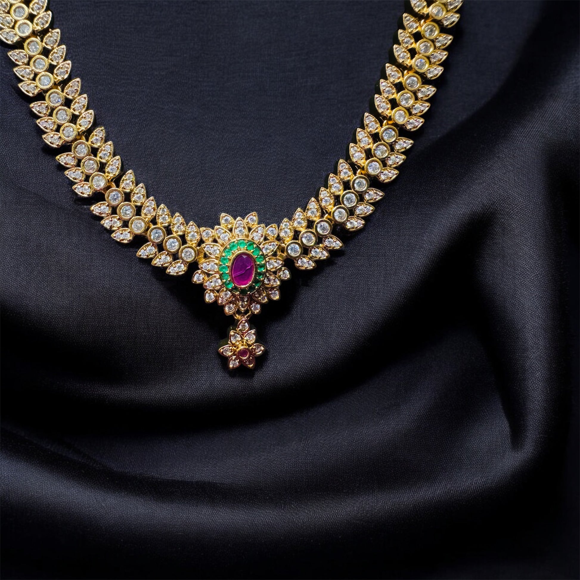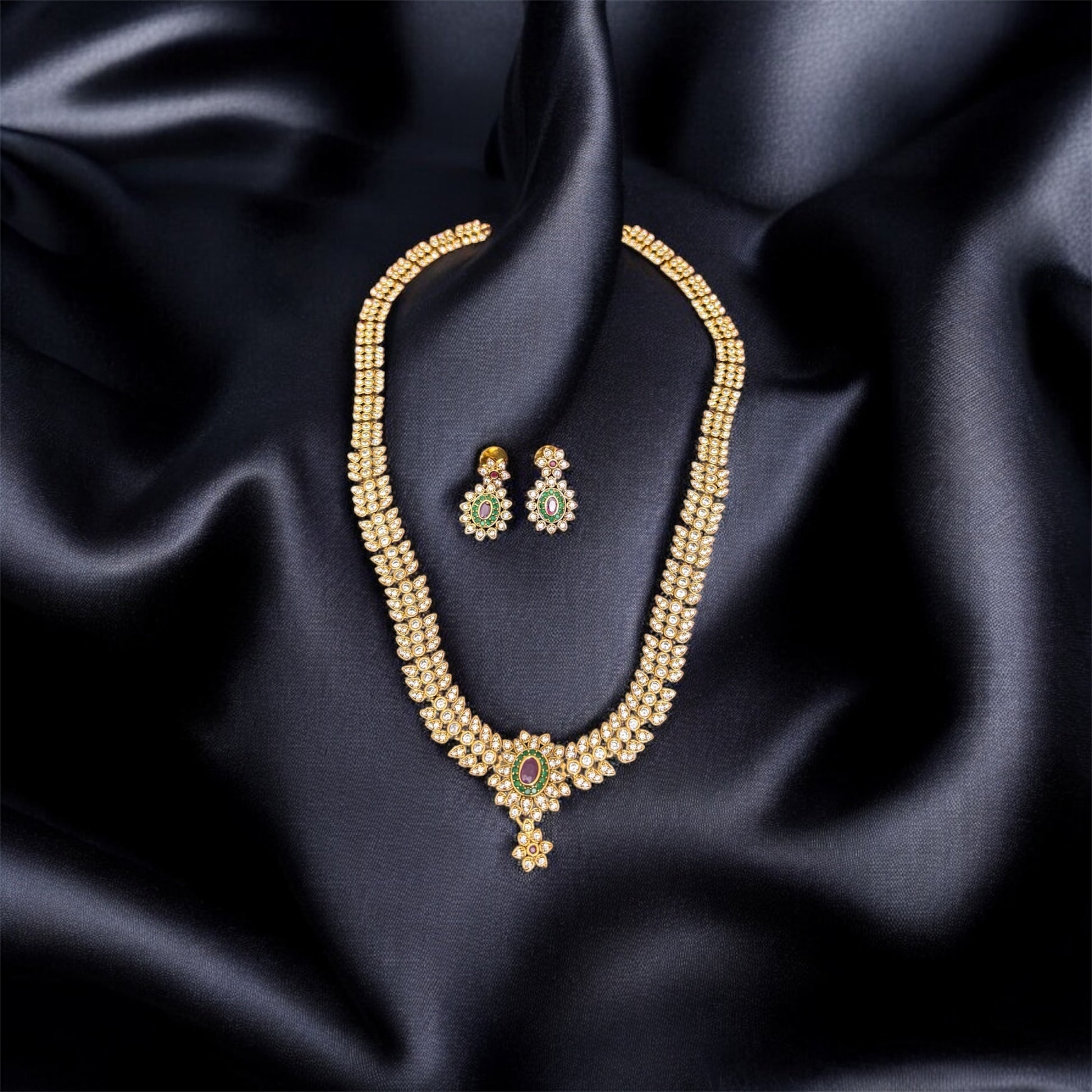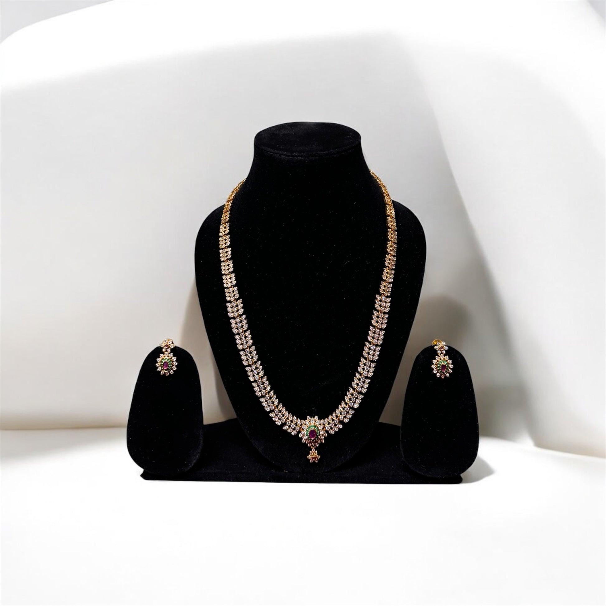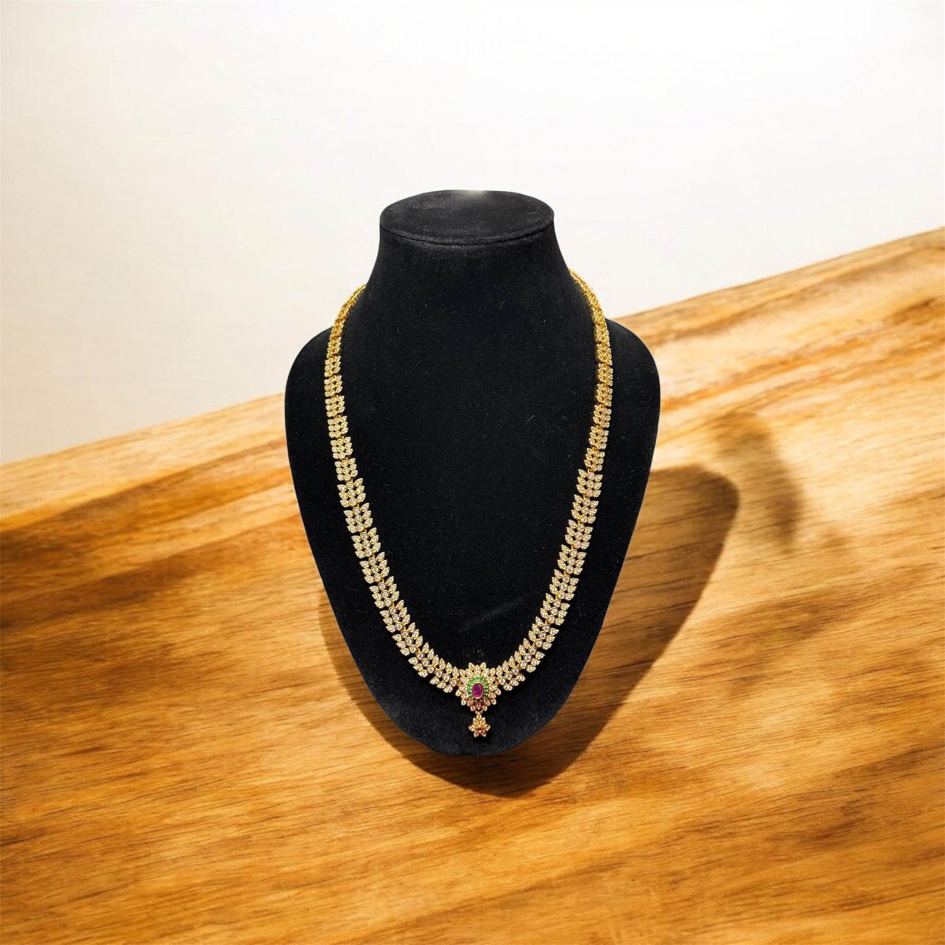 This exquisite Sparkling White Stone Haaram & Earrings Set adds a touch of elegance to any outfit. The lustrous white stones reflect light, creating a stunning sparkle. Made with precision and expertise, this set is a true statement of sophistication. Complete your look with this stunning jewelry set.