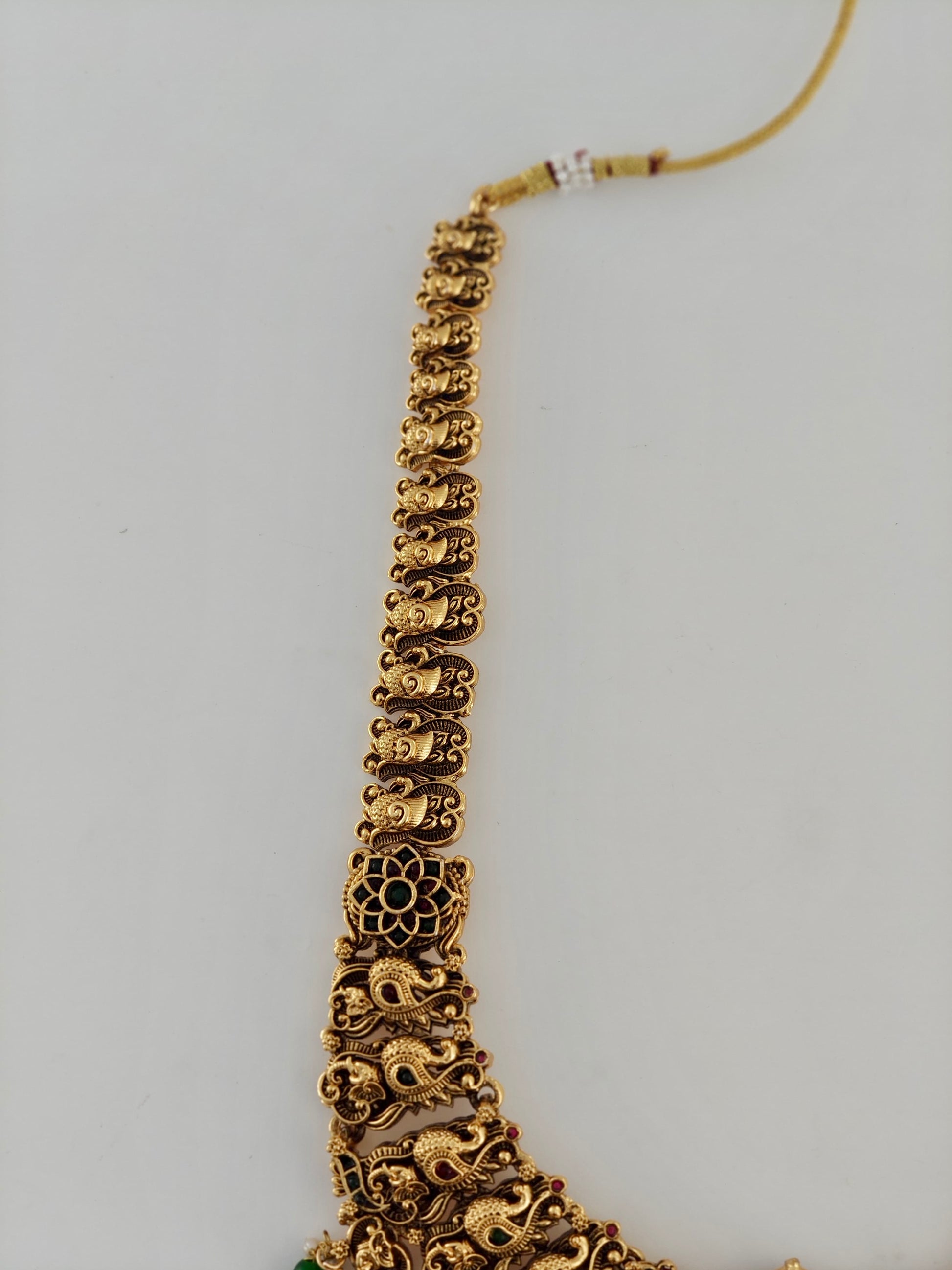 Temple Bridal Haaram with Green Beads Elevate your bridal ensemble with this exquisite temple haaram, a timeless piece that embodies traditional craftsmanship and sophisticated elegance. Featuring lustrous green beads intricately arranged in a classic temple design, this haaram complements both contemporary and conventional bridal attire. The carefully selected beads offer a rich, jewel-toned aesthetic that enhances your complexion while maintaining the authenticity of temple jewelry. Perfect for weddings, festivals, and special occasions, this haaram serves as a versatile accessory that transitions seamlessly from ceremonial wear to festive celebrations. An investment in heritage-inspired jewelry that celebrates cultural artistry.