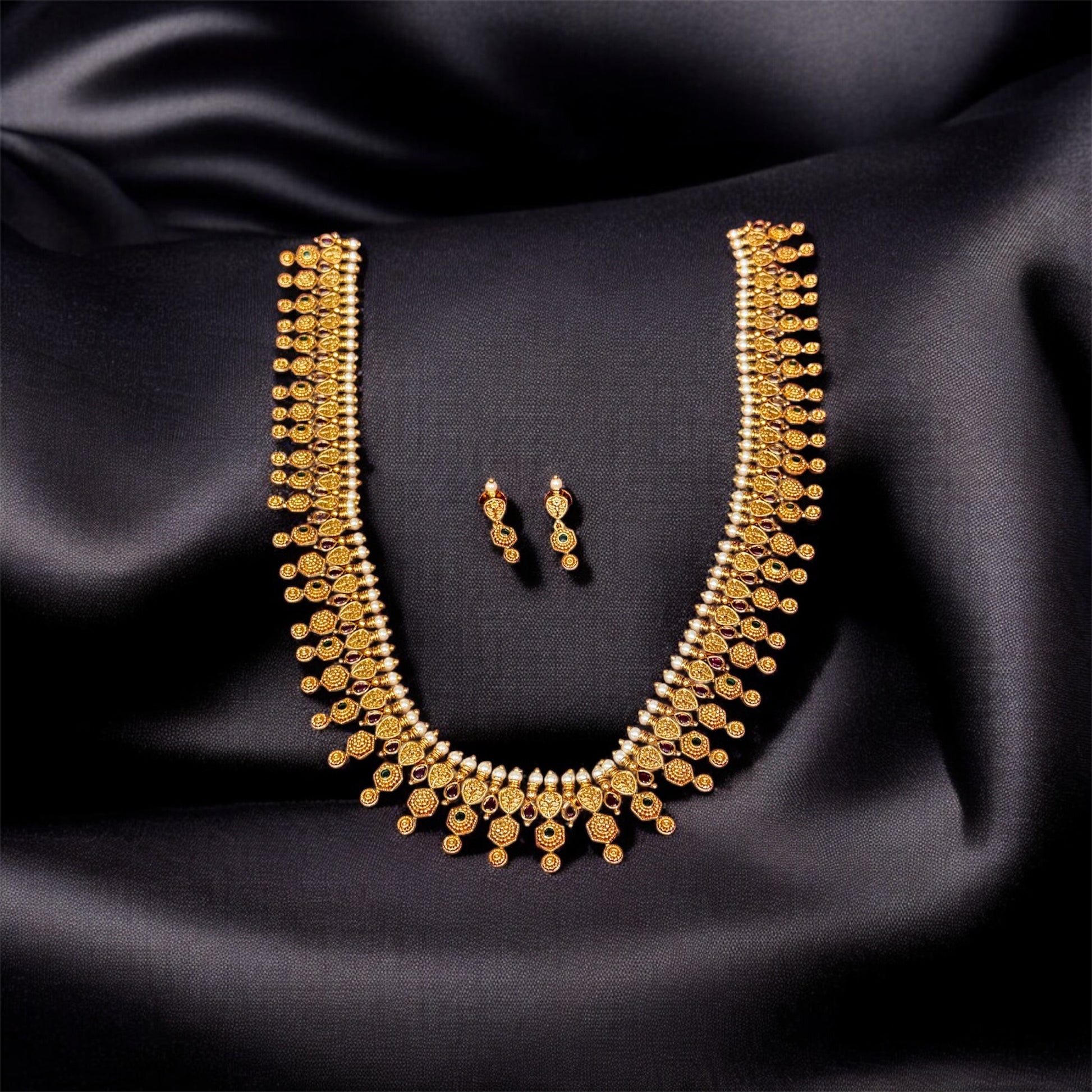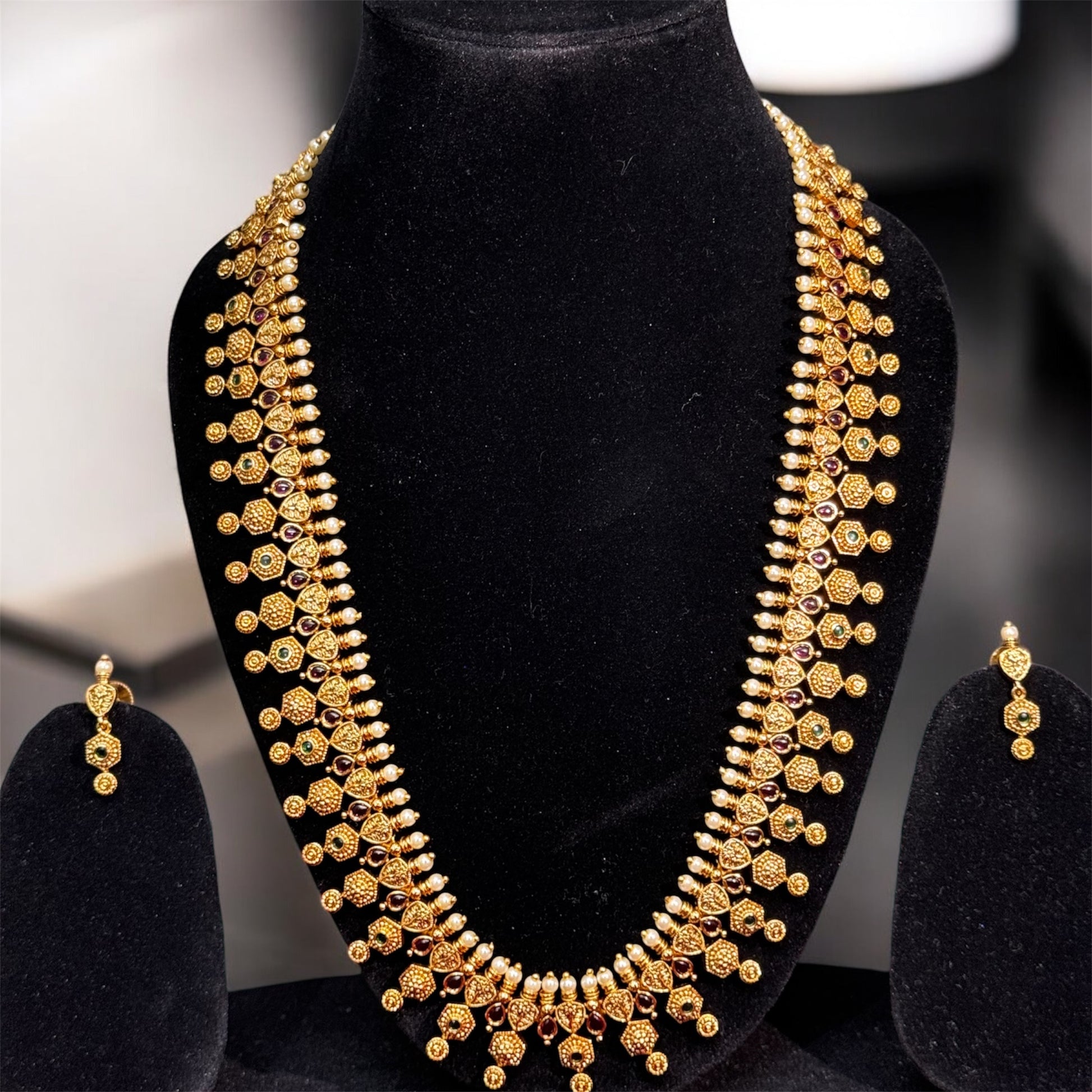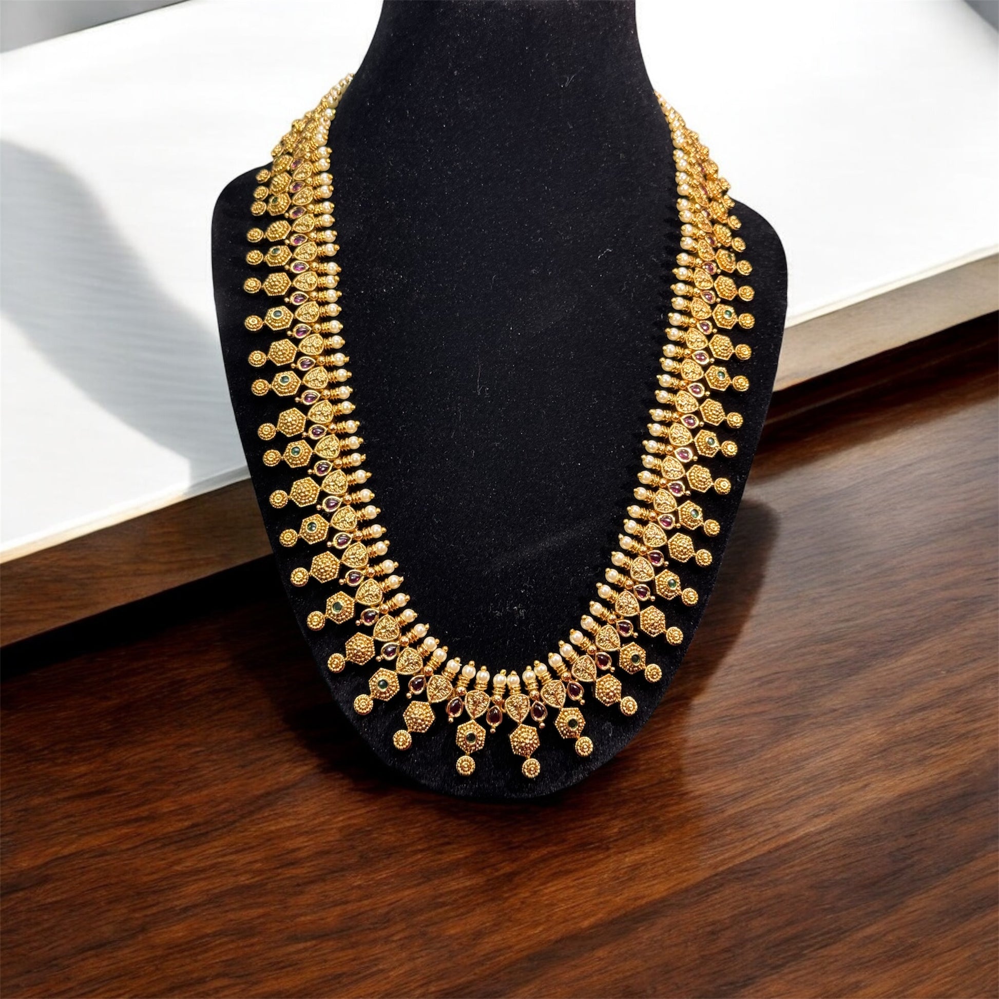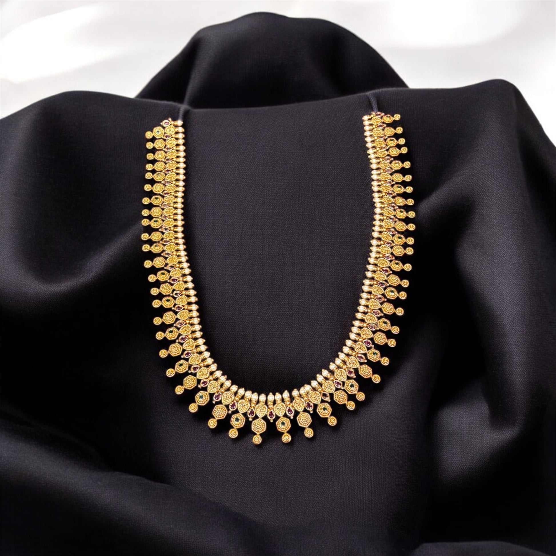 This Premium Matte Finish Bridal Haaram is the perfect choice for any bride looking for a sophisticated and elegant accessory. Crafted with high-quality materials, it has a stunning matte finish that adds a modern touch to any bridal ensemble. Its sleek design and premium finish make it a must-have for any modern bride. Upgrade your bridal look with this exquisite haaram.