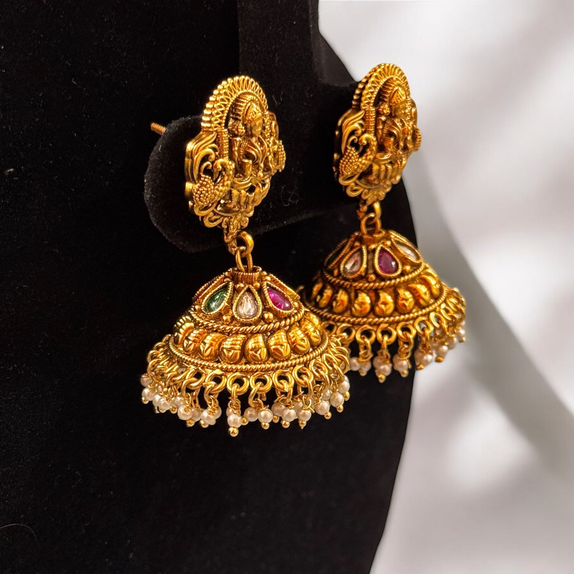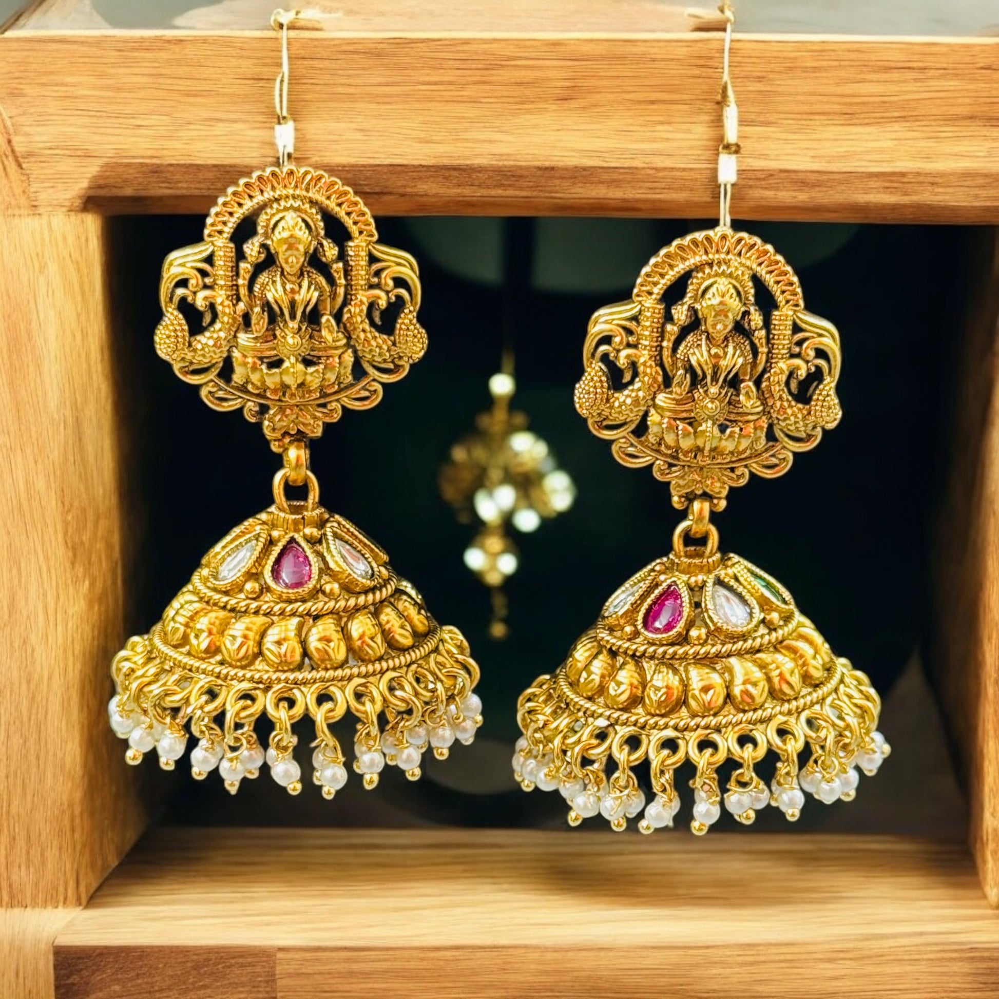 This stunning Bridal Jhumka is adorned with intricate engravings of the goddess Lakshmi, known for bringing blessings and prosperity. Handcrafted with care, these earrings are the perfect addition to any bridal ensemble. Elevate your look with this beautiful and meaningful piece of jewelry.