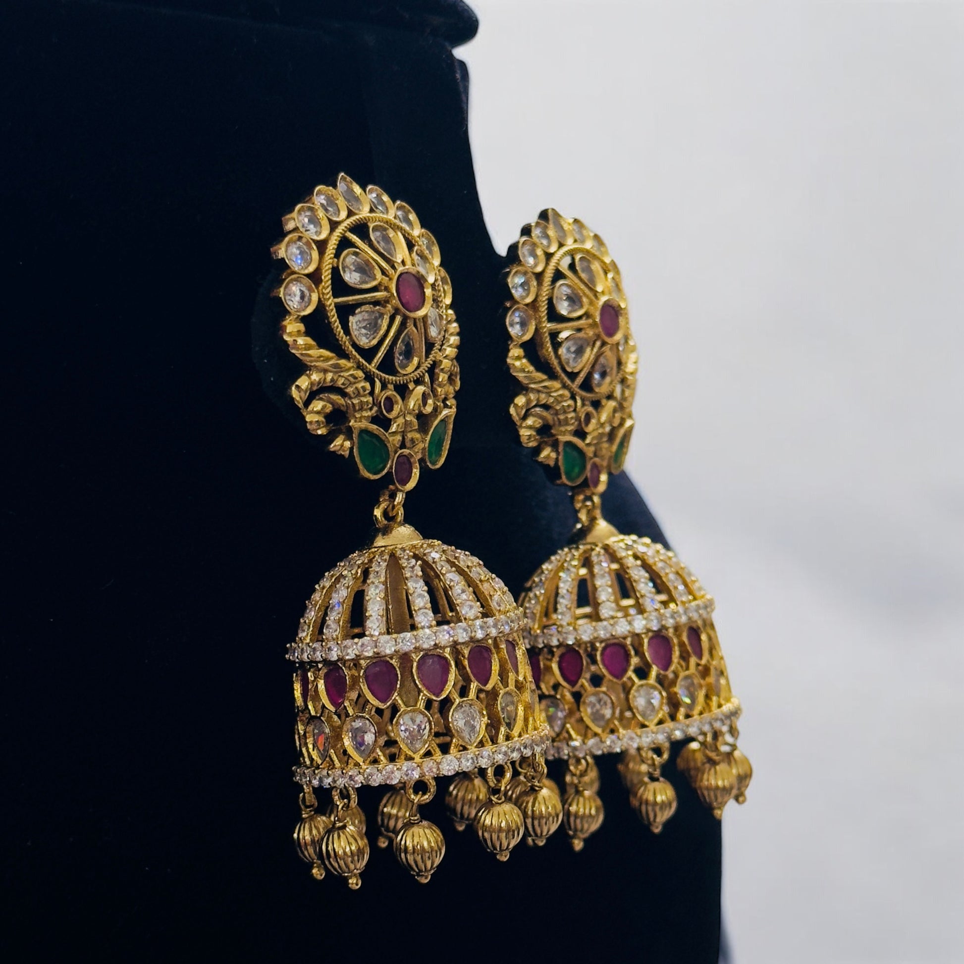 Beautiful Peacock Engraved Multi-stone Bridal Jhumka