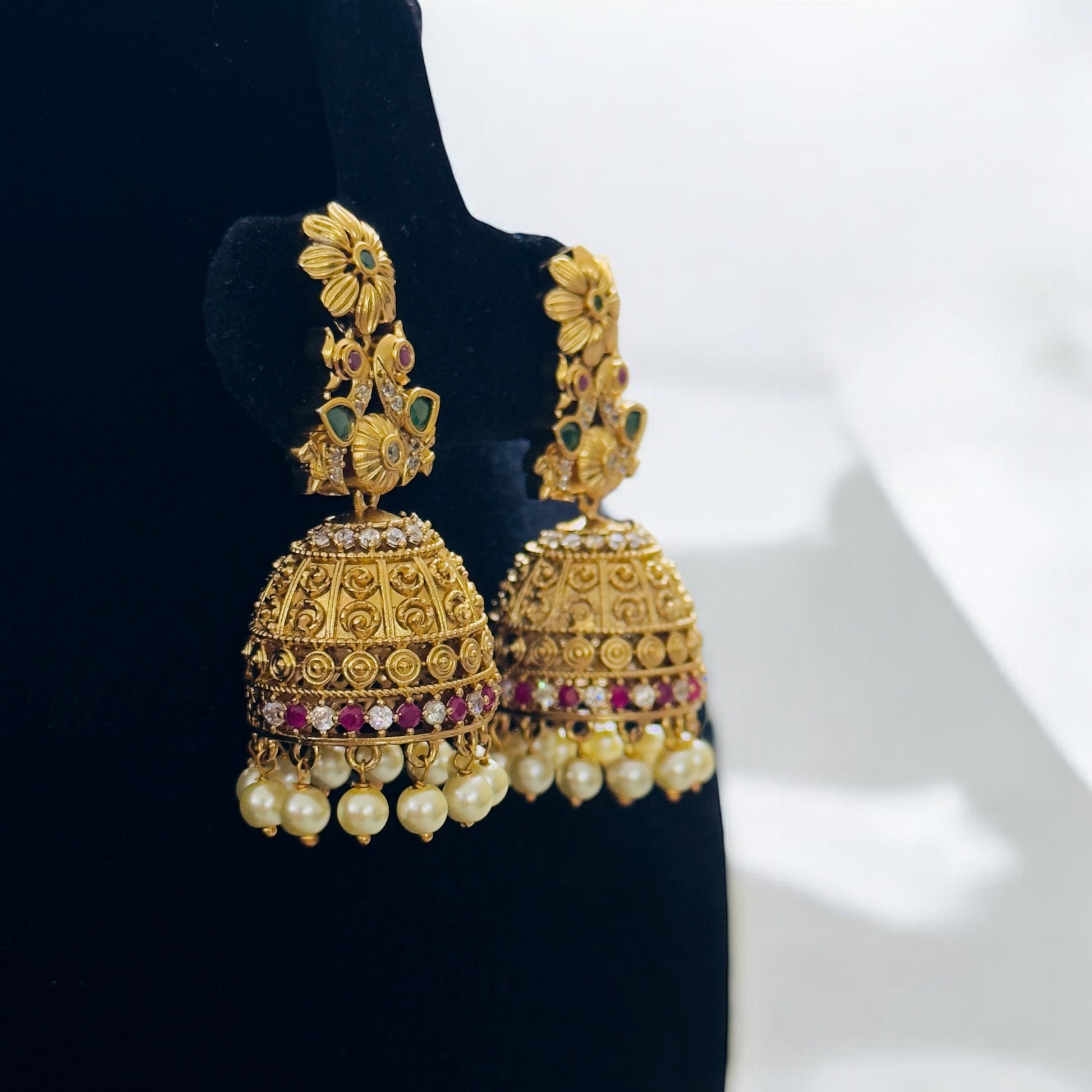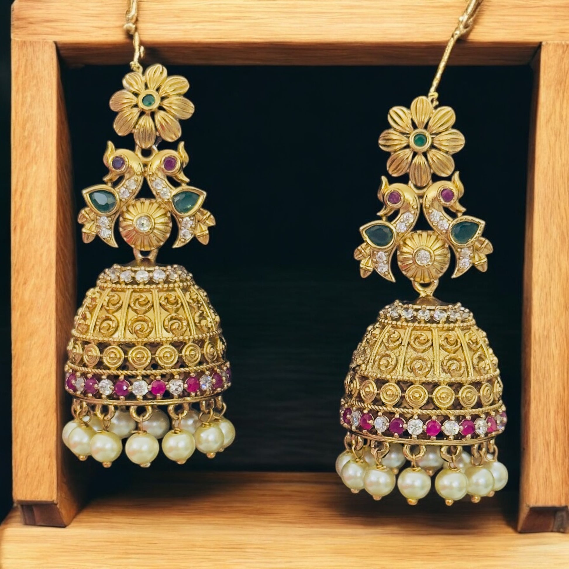 This elegant Jhumka earrings features intricate floral peacock engravings and delicate pearls, perfect for adding a touch of sophistication to any outfit. Made with high-quality materials, these earrings are sure to make a statement and elevate your style. A must-have for any fashion-forward individual.