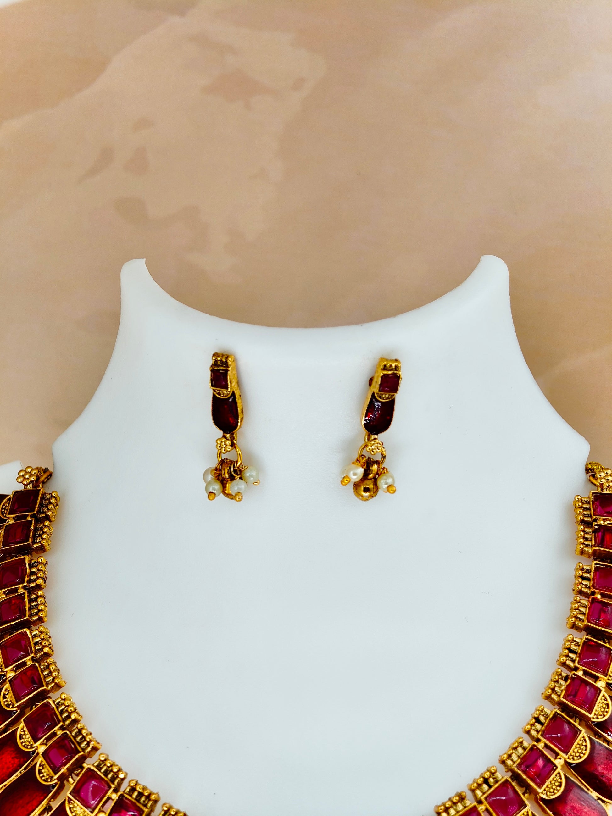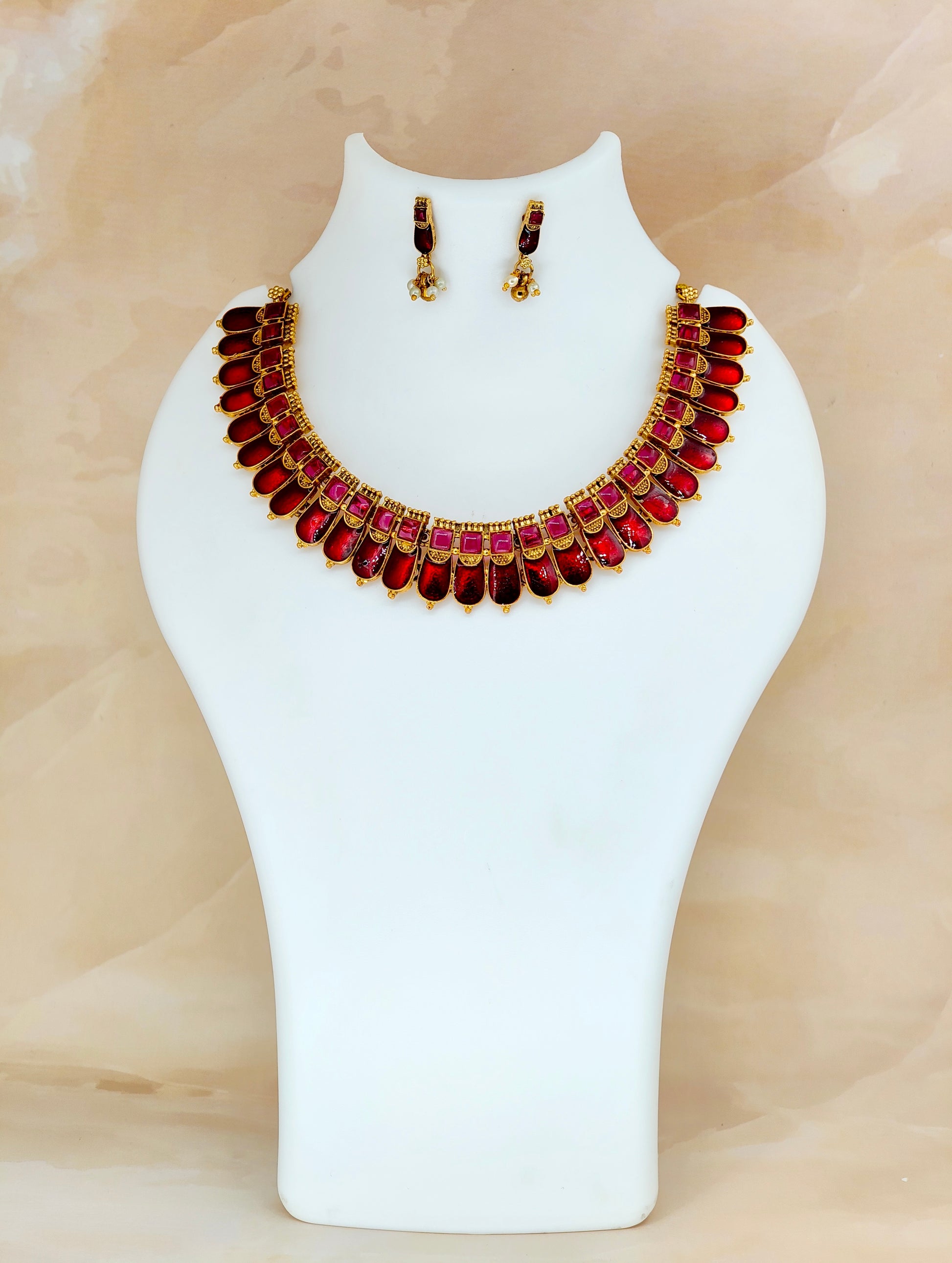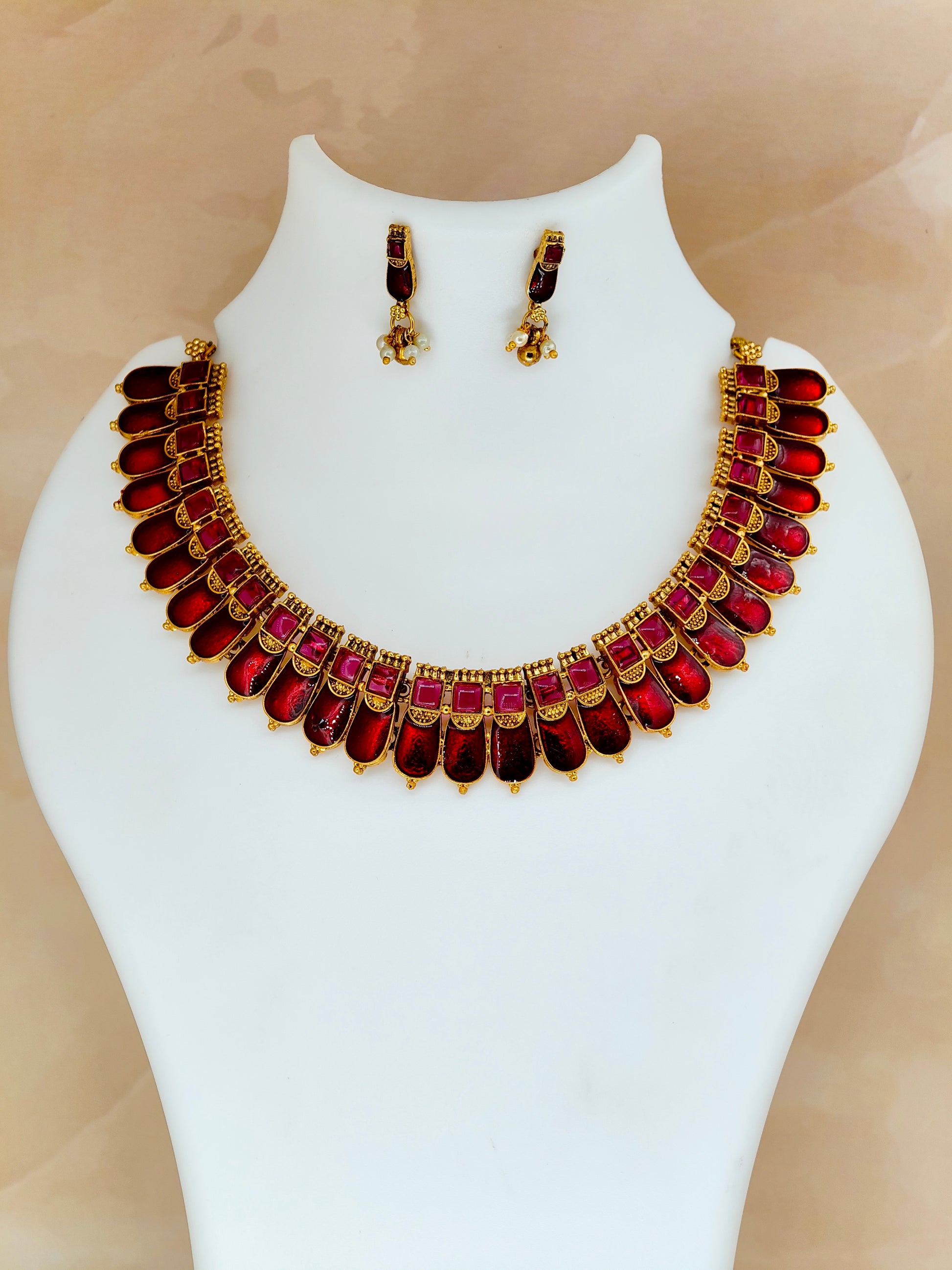 The Kovai Palakka Necklace in red showcases exquisite craftsmanship inspired by traditional South Indian designs. Crafted with intricate detailing, this necklace features vibrant red elements that enhance its elegant appeal. Perfect for cultural events and festive occasions, it adds a rich touch to any outfit while reflecting timeless artistry. Durable and carefully finished, this piece offers both beauty and longevity for discerning jewelry enthusiasts.