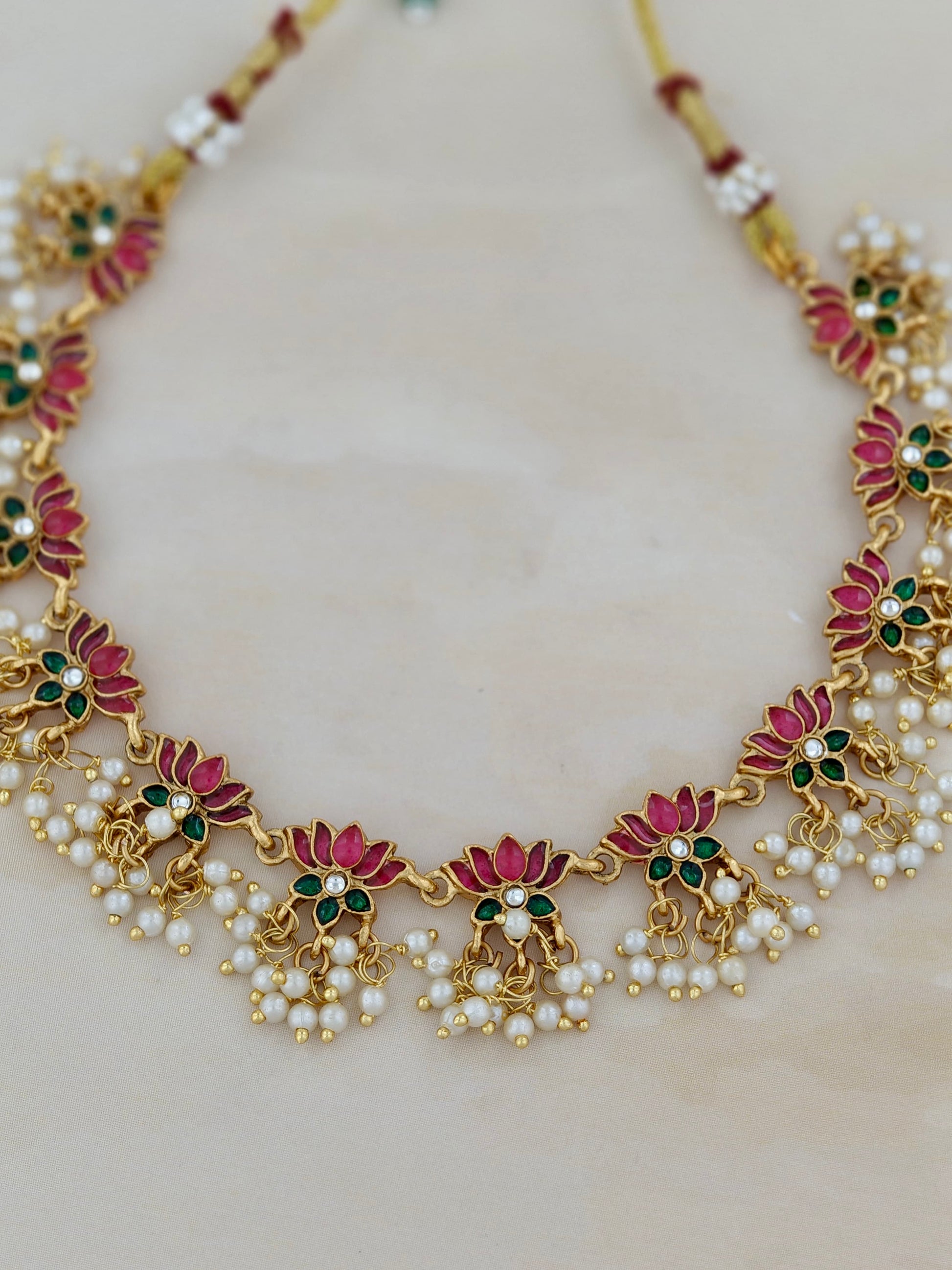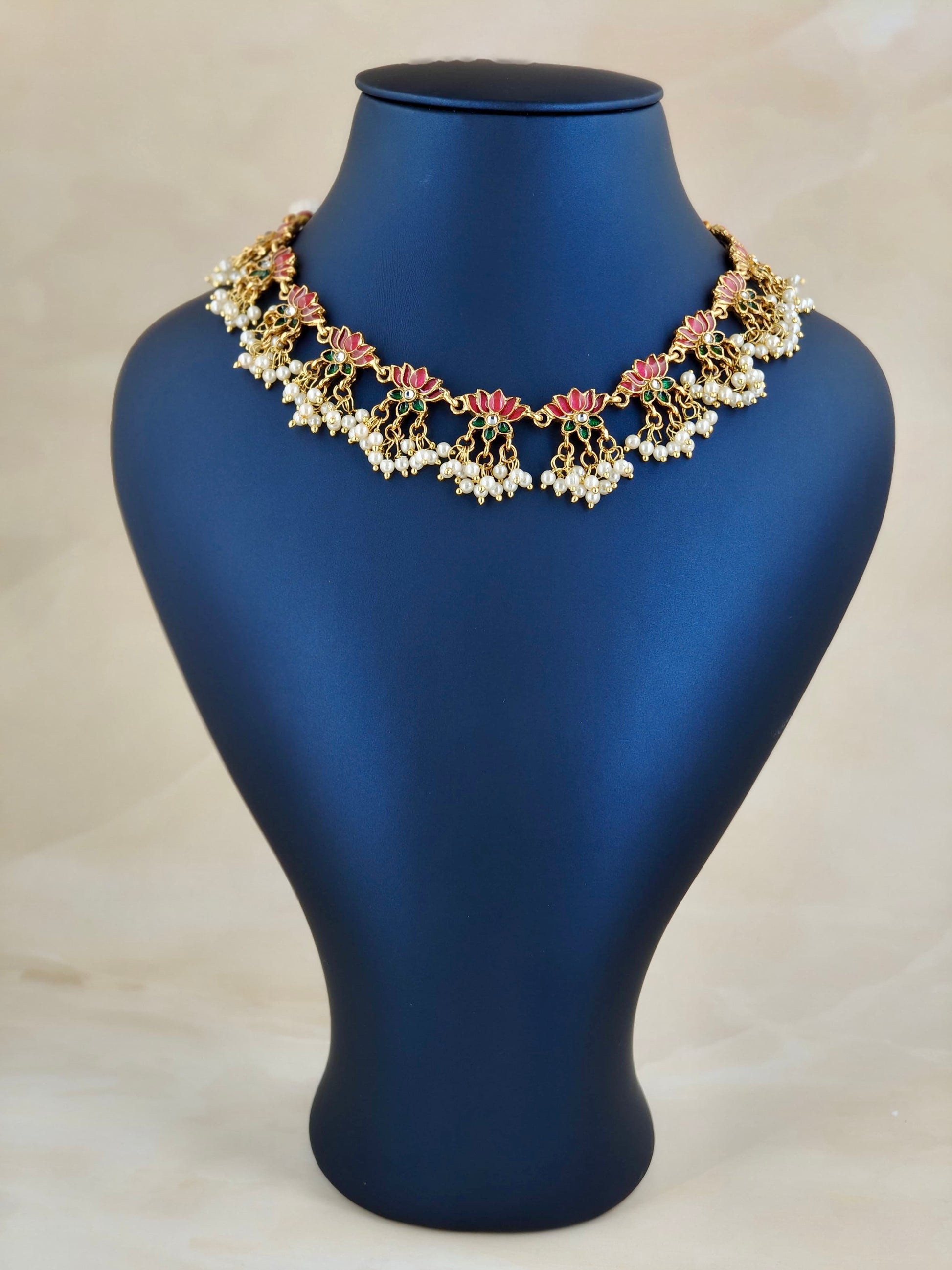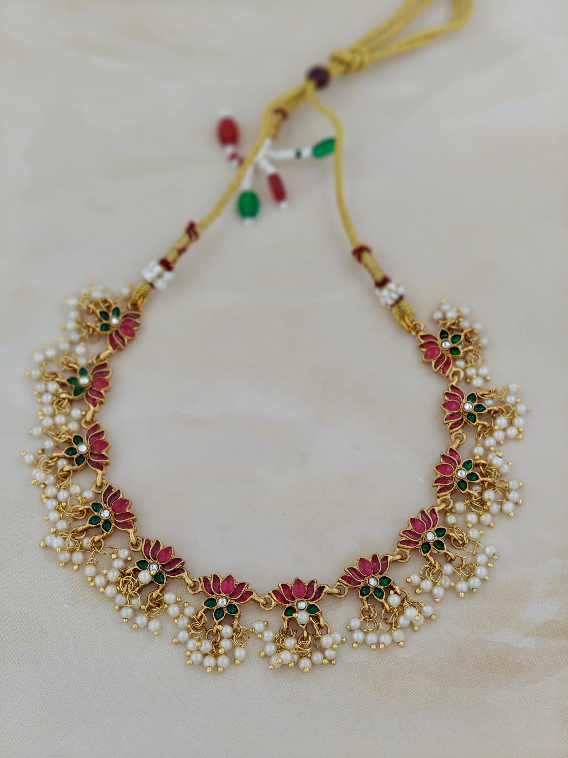 Elevate your elegance with the Lotus Necklace featuring lustrous pearls. This finely crafted piece blends the symbolic beauty of the lotus with the timeless sophistication of pearls, offering a refined accessory that enhances both formal and casual outfits. The necklace's delicate design ensures comfort and versatility, making it a distinguished addition to any jewelry collection. Perfect for those who appreciate subtle luxury and expert craftsmanship.
