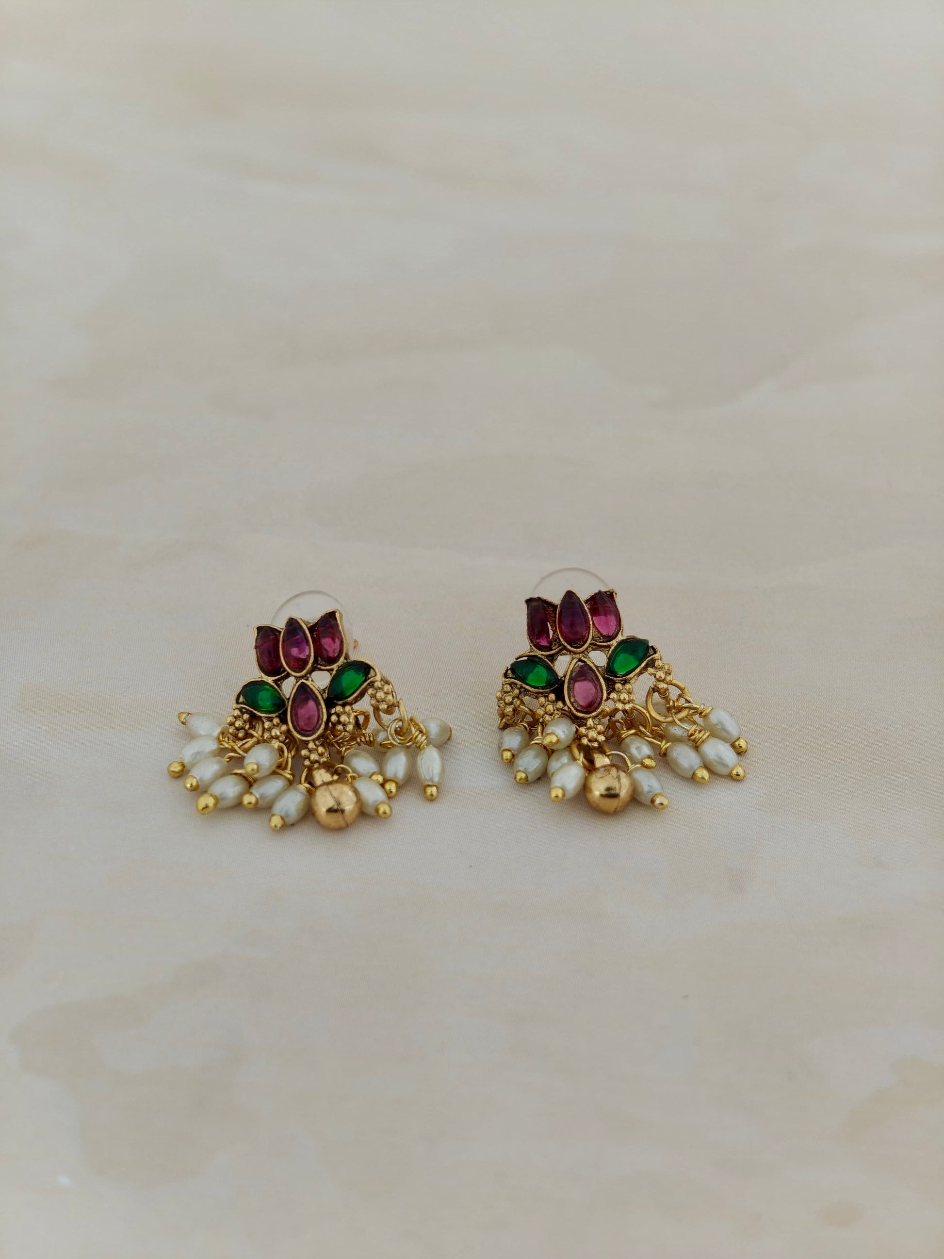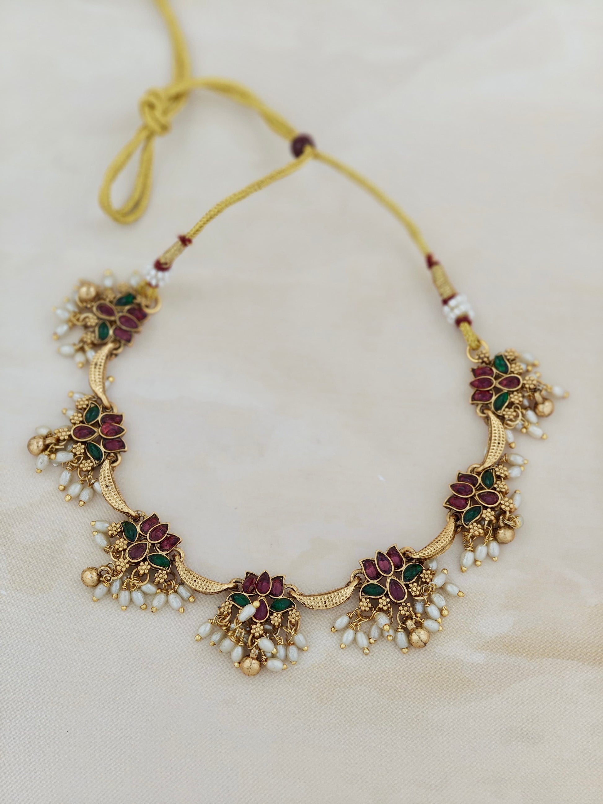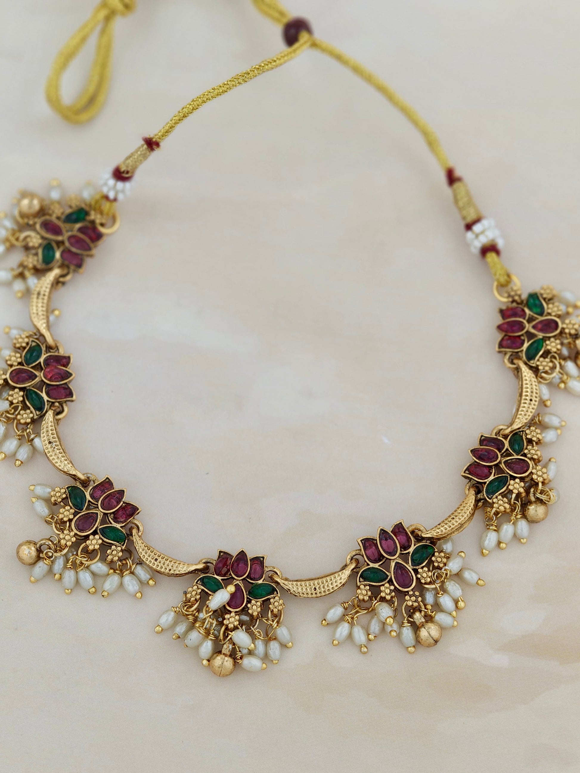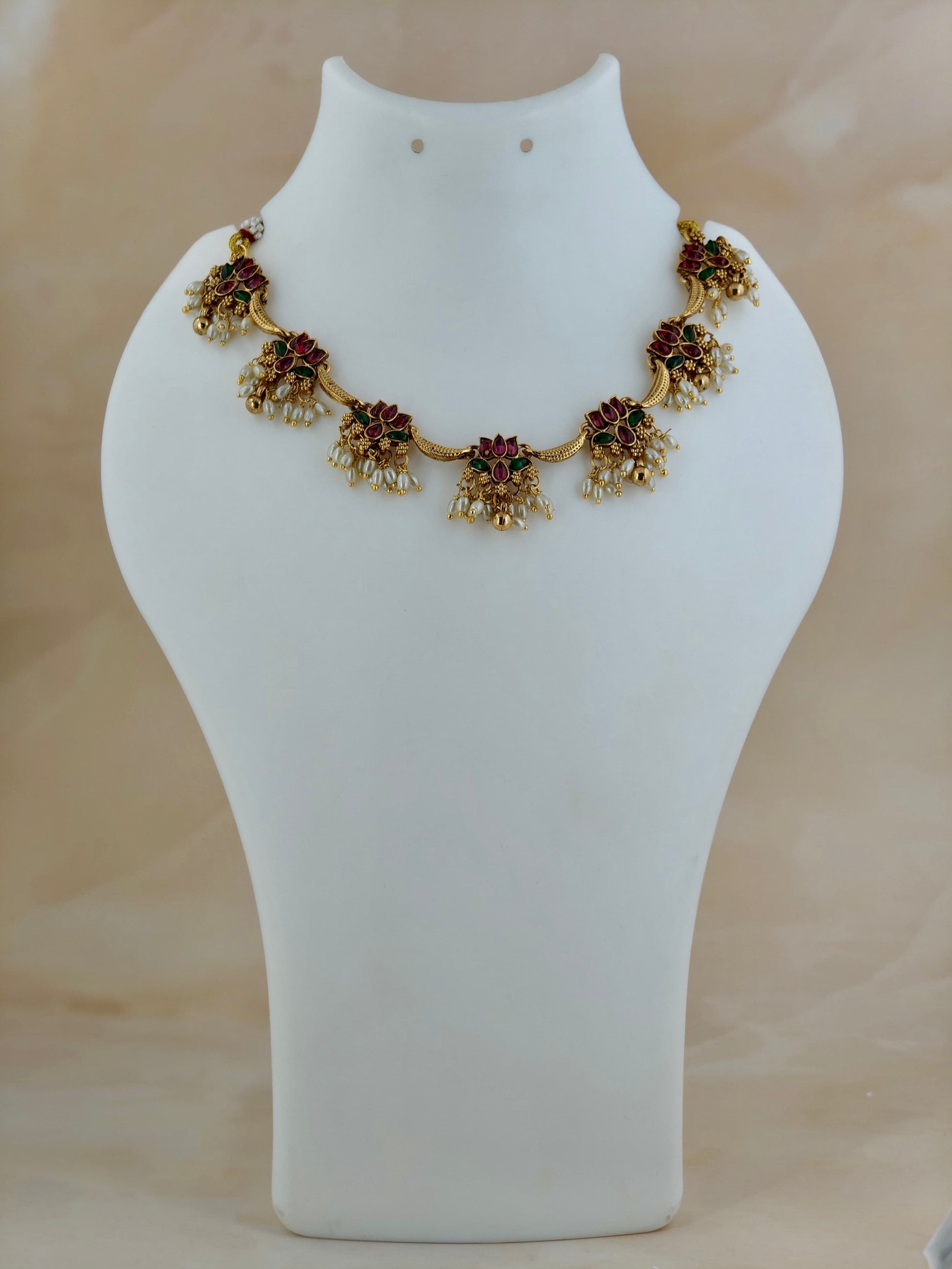 The Beautiful Kemp Stone Lotus Necklace with Pearls showcases exquisite craftsmanship, blending vibrant kemp stones with lustrous pearls in a graceful lotus motif. This combination enhances the necklace's elegance, making it ideal for special occasions or adding a refined touch to your collection. Its balanced design marries tradition and sophistication, ensuring lasting appeal and versatility.