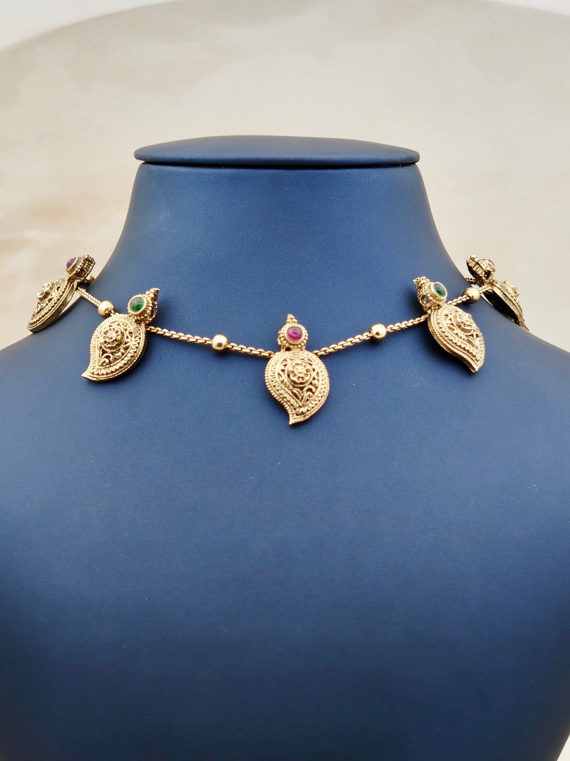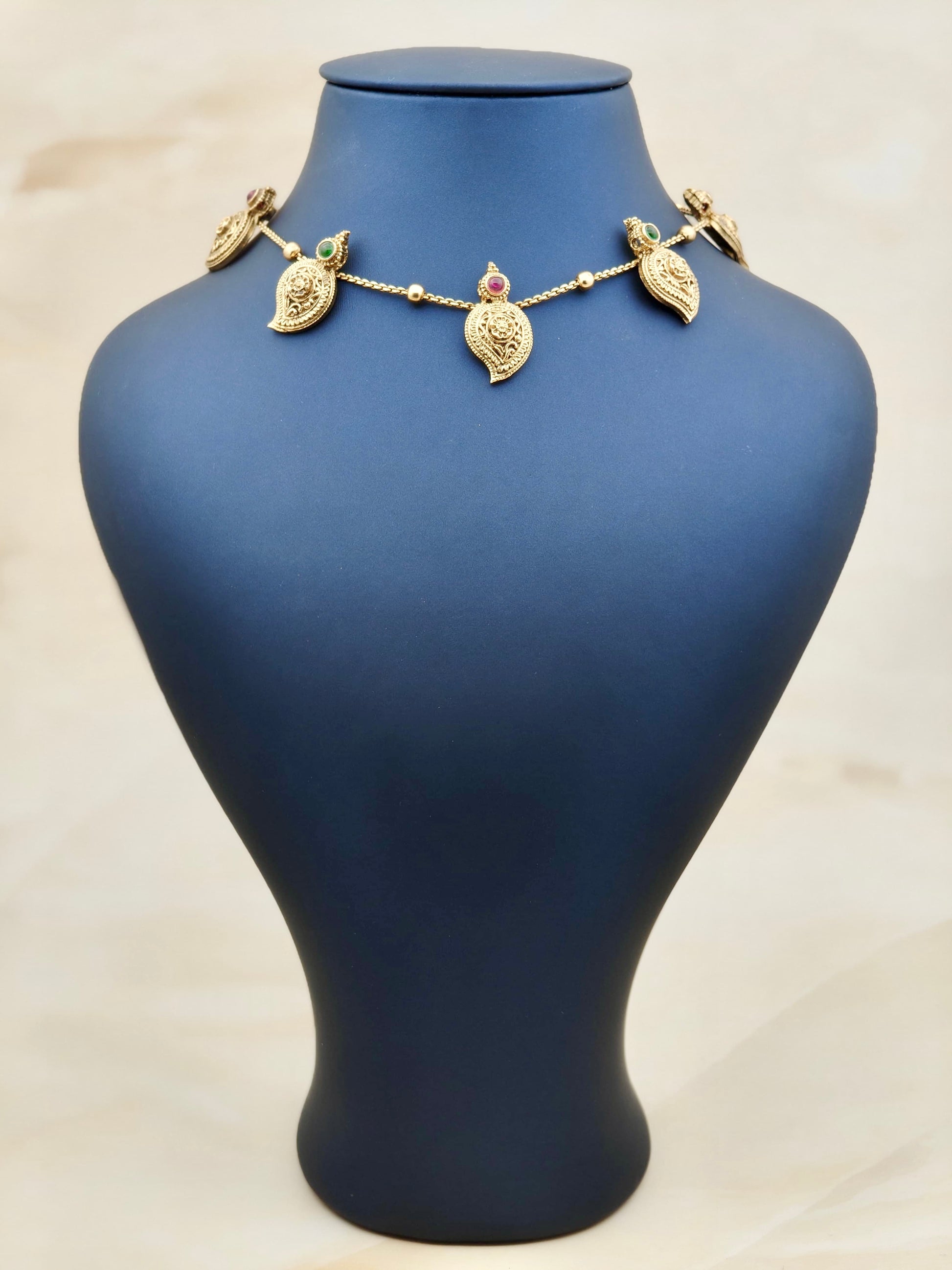 This Multi Pendant Mango Necklace features delicately crafted mango-shaped pendants arranged to offer a sophisticated and timeless appeal. Perfect for enhancing traditional attire or adding an elegant touch to contemporary outfits, it combines artistry with cultural heritage. Expertly designed for durability and comfort, this necklace is an exquisite accessory that highlights craftsmanship and style.
