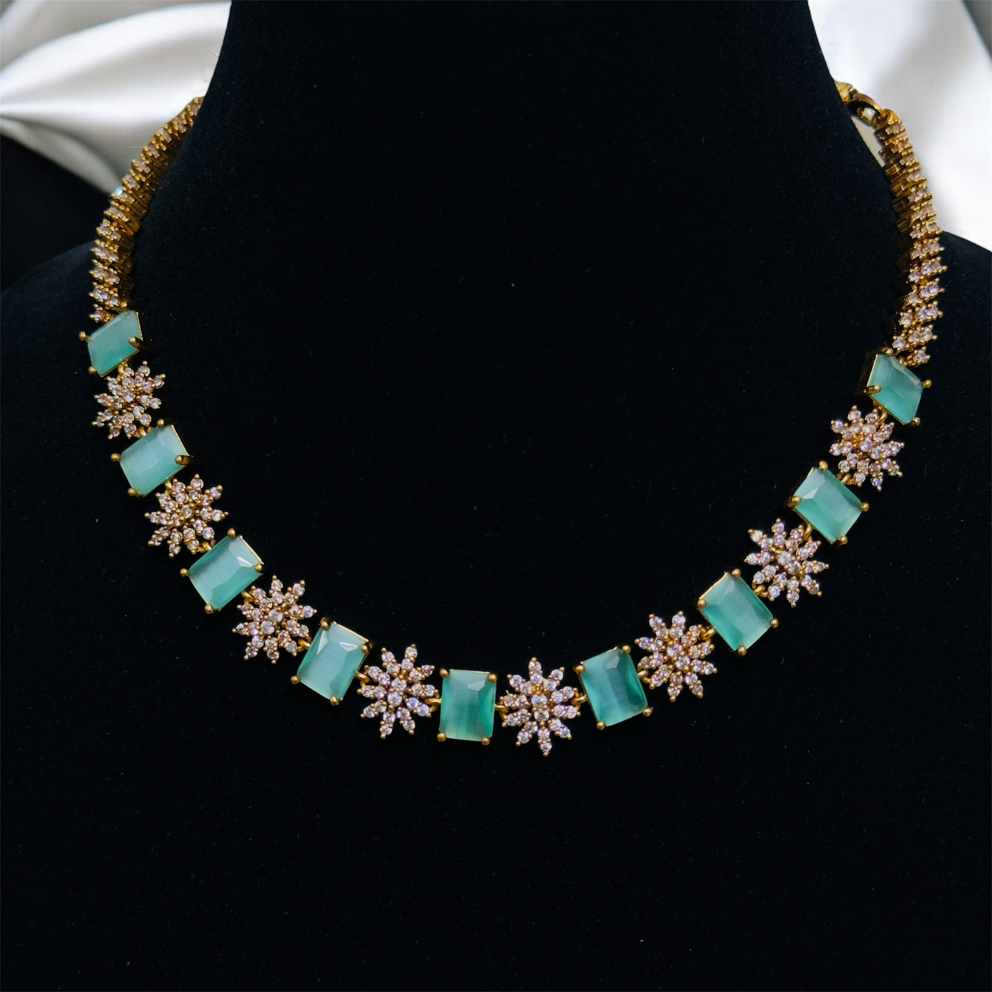 Experience elegance with our Stunning Simple AD Stone Necklace & Earrings Set. Made with high-quality materials, this set adds a touch of sophistication to any outfit. The intricate design and sparkling stones make this set a must-have for any special occasion. Enhance your style and make a statement with this stunning set.