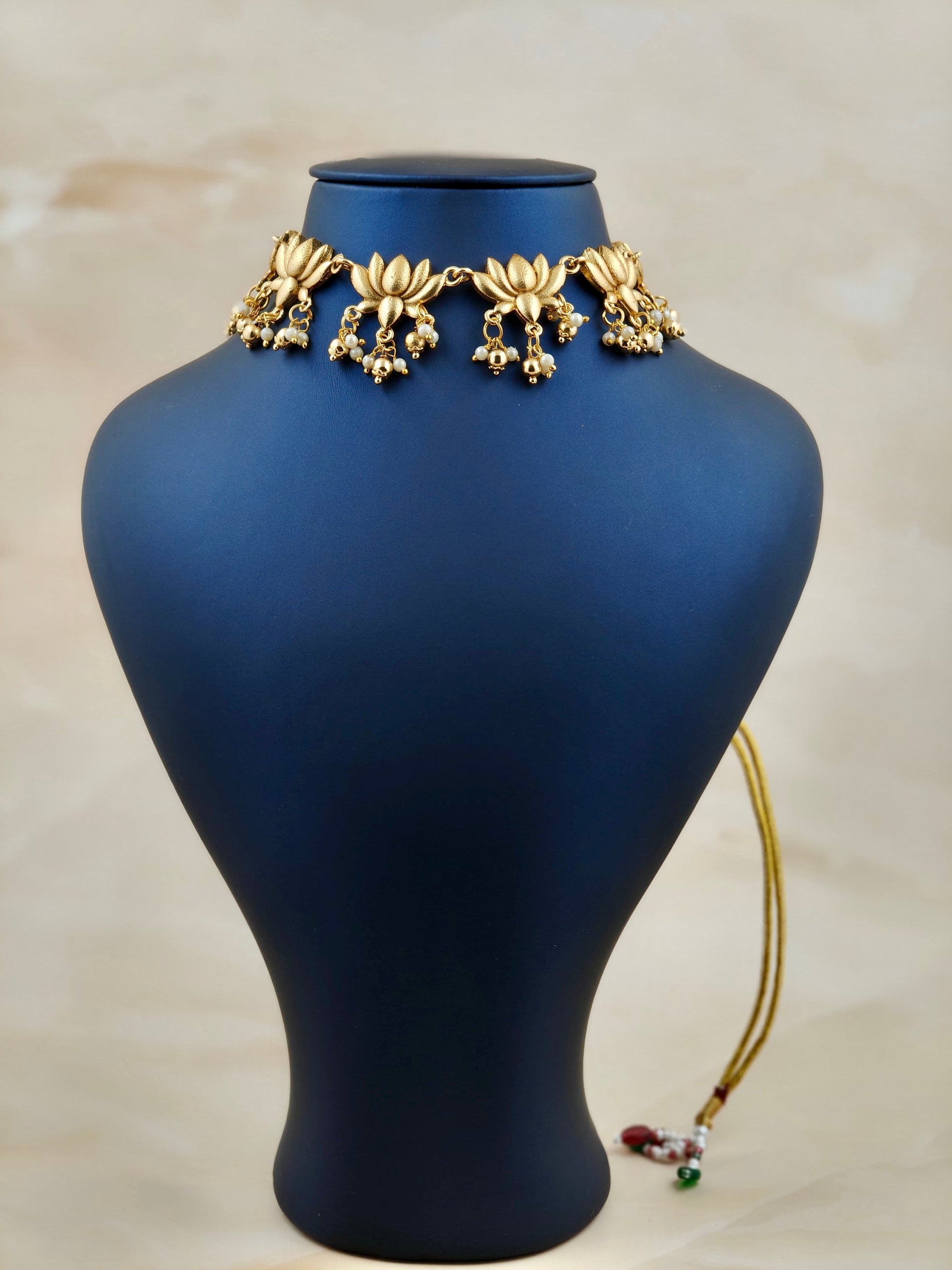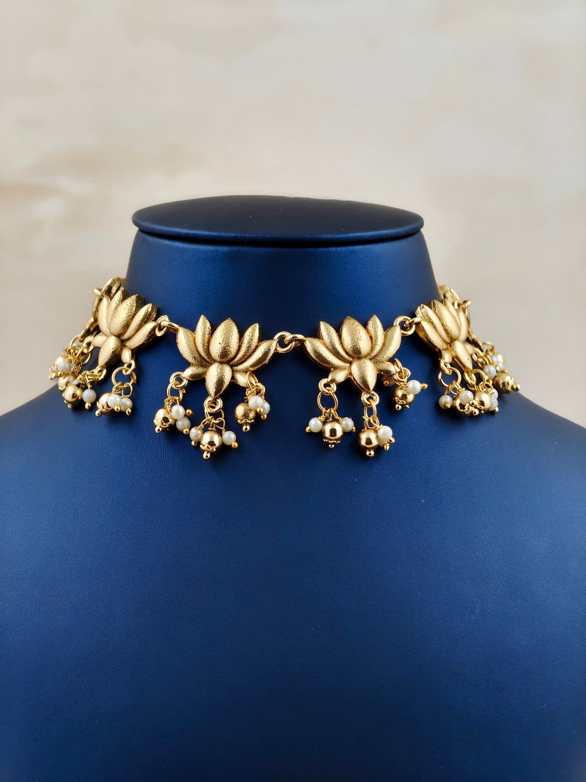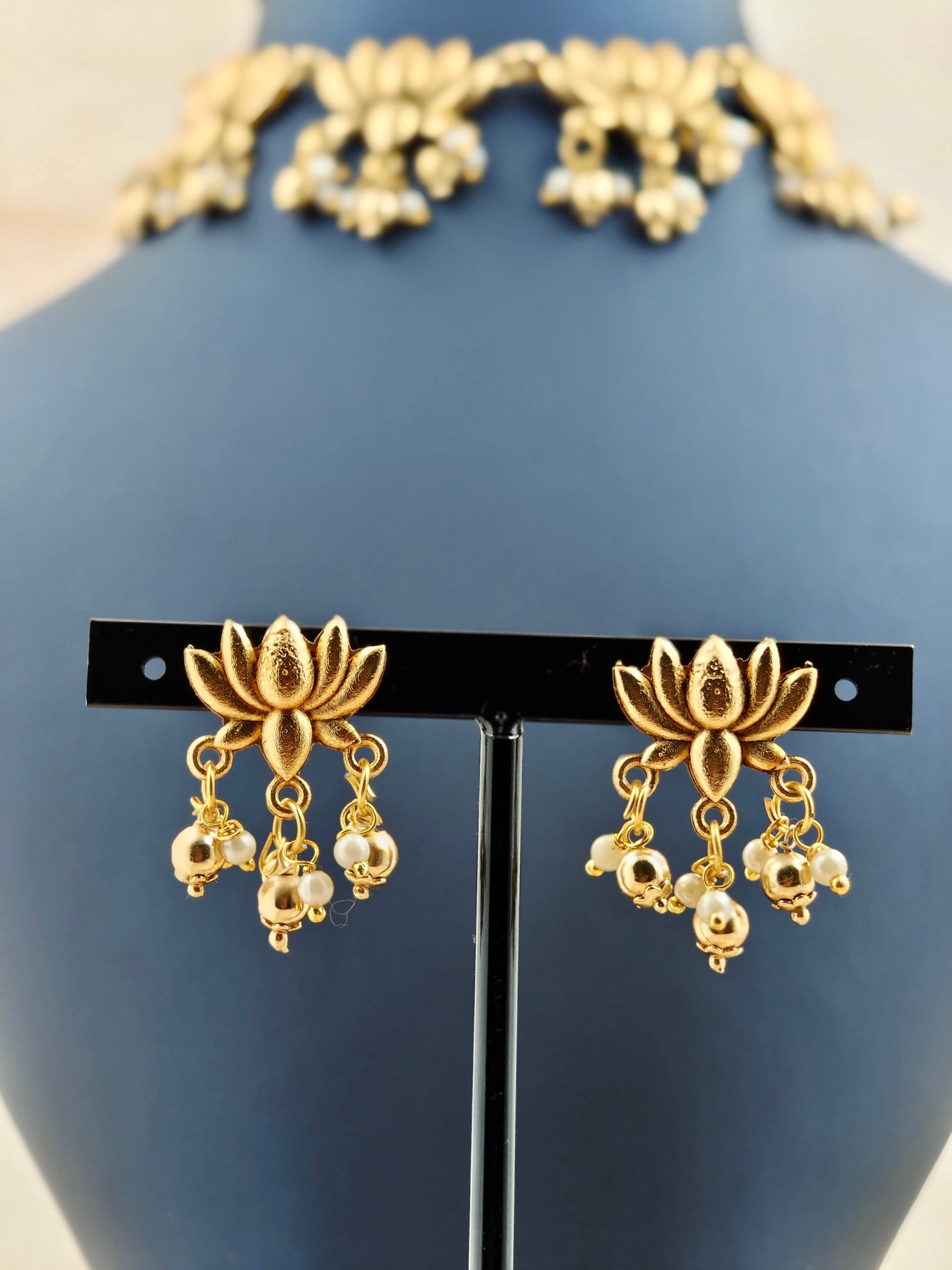This Antique Lotus Necklace with Earrings set showcases intricate craftsmanship inspired by traditional motifs. The detailed lotus design symbolizes purity and elegance, making it a timeless addition to your jewelry collection. Perfect for special occasions, this set enhances your ensemble with a refined, classic charm. Crafted to offer both beauty and durability, it complements a variety of styles with expert finesse.