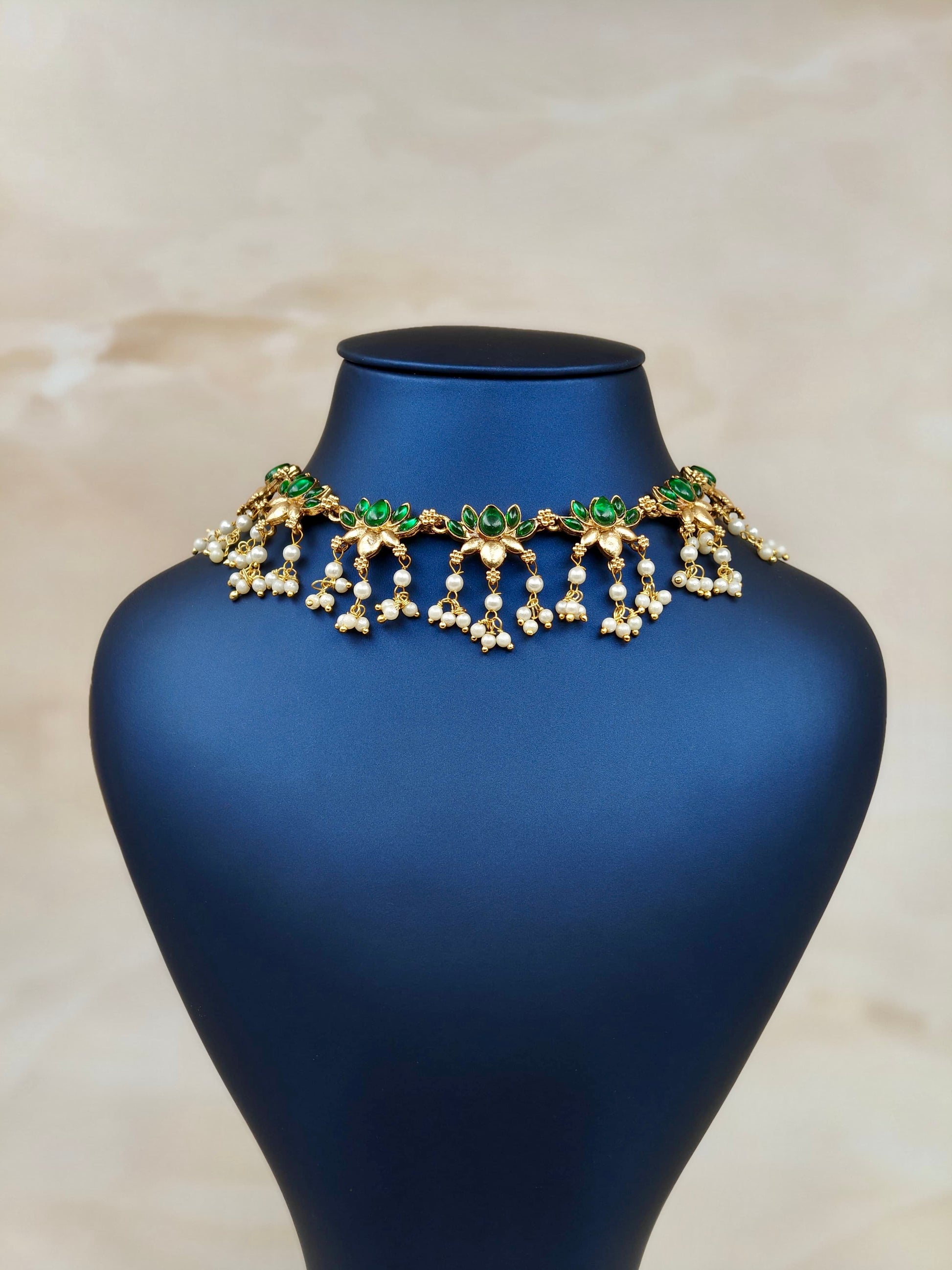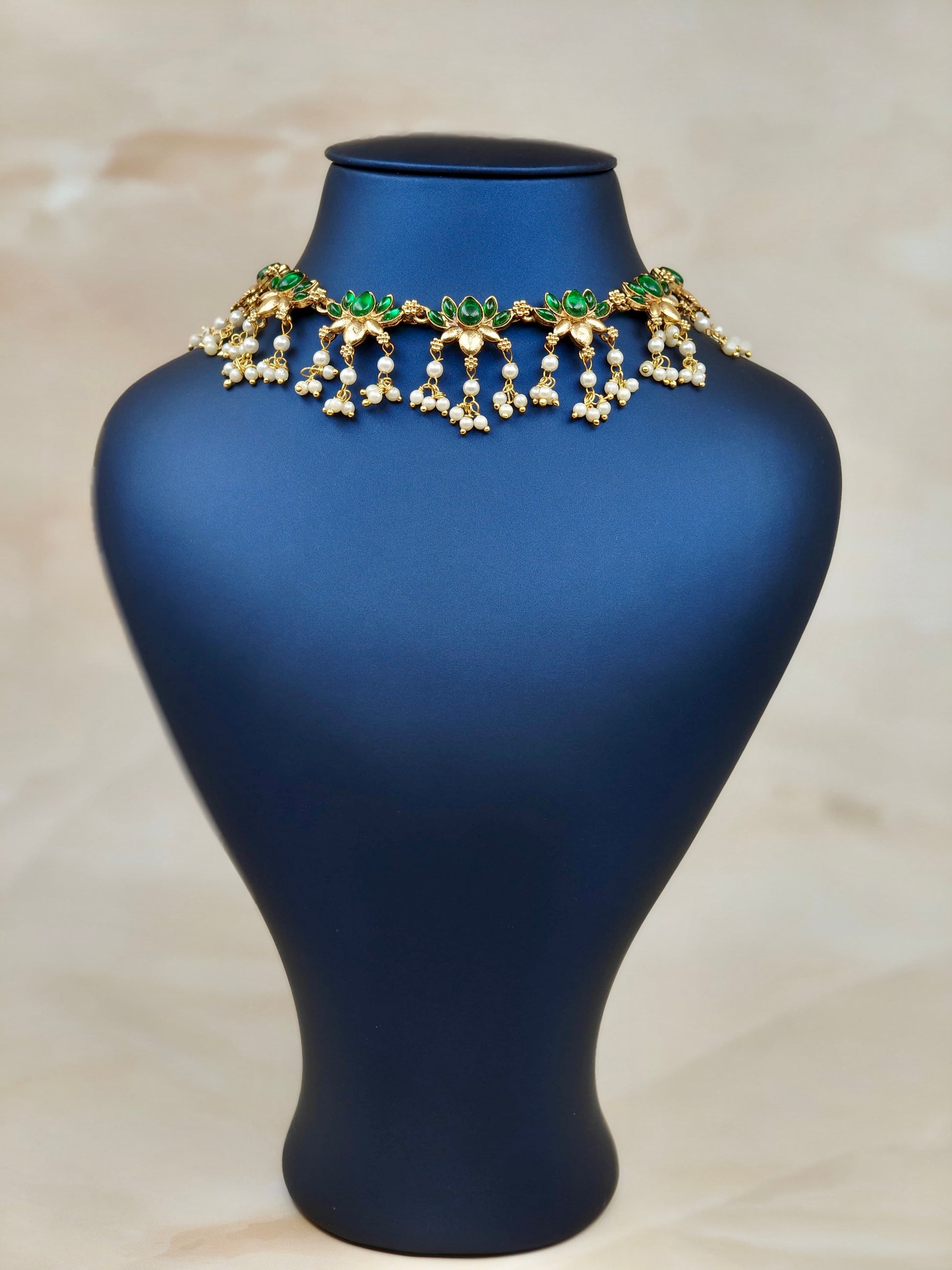 The Kemp Lotus Necklace showcases exquisite craftsmanship with traditional Kemp stones arranged in a delicate lotus motif. This piece combines timeless elegance with cultural heritage, making it an ideal accessory for enhancing formal and festive attire. Its intricate design and vibrant hues offer a refined statement of sophistication and artistry. Perfect for collectors and connoisseurs of classic jewelry styles.