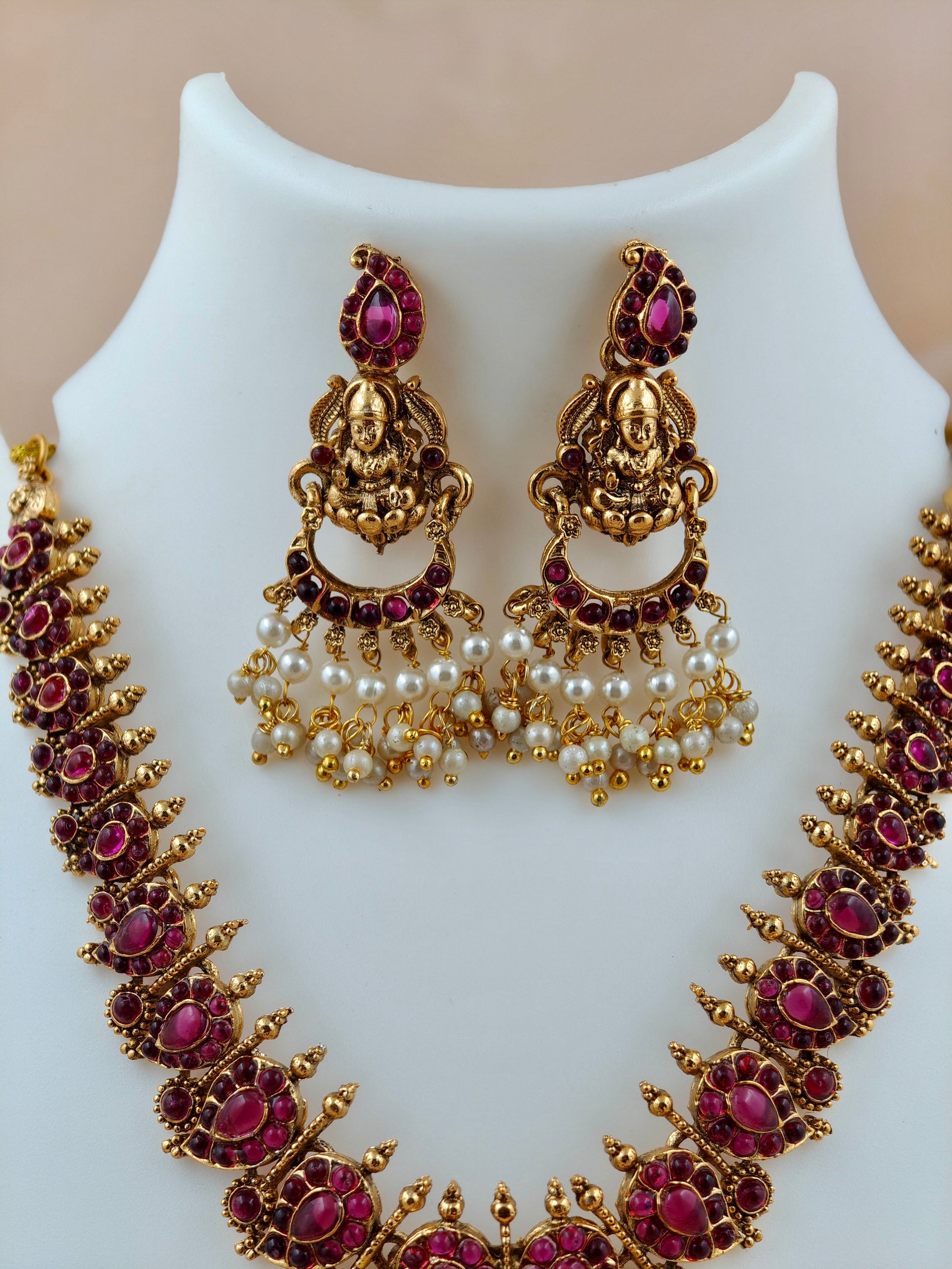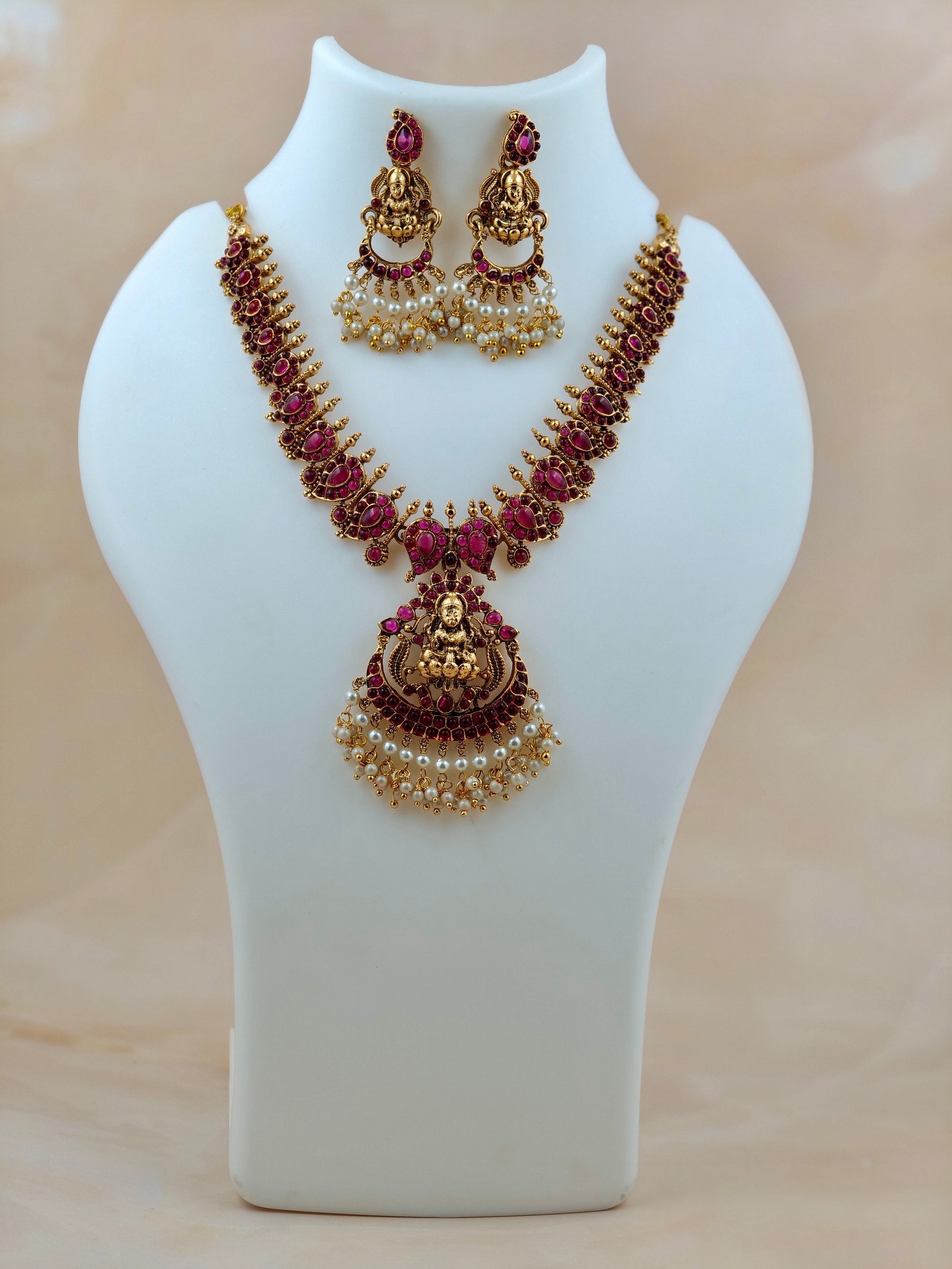 Elevate your collection with the Lakshmi Kempstone Necklace Ruby, a refined piece that combines traditional elegance with expert craftsmanship. Featuring vibrant ruby stones, this necklace offers a striking focal point that enhances any ensemble. Its meticulous design ensures durability and timeless appeal, making it a sophisticated choice for those who appreciate quality and heritage in their jewelry.