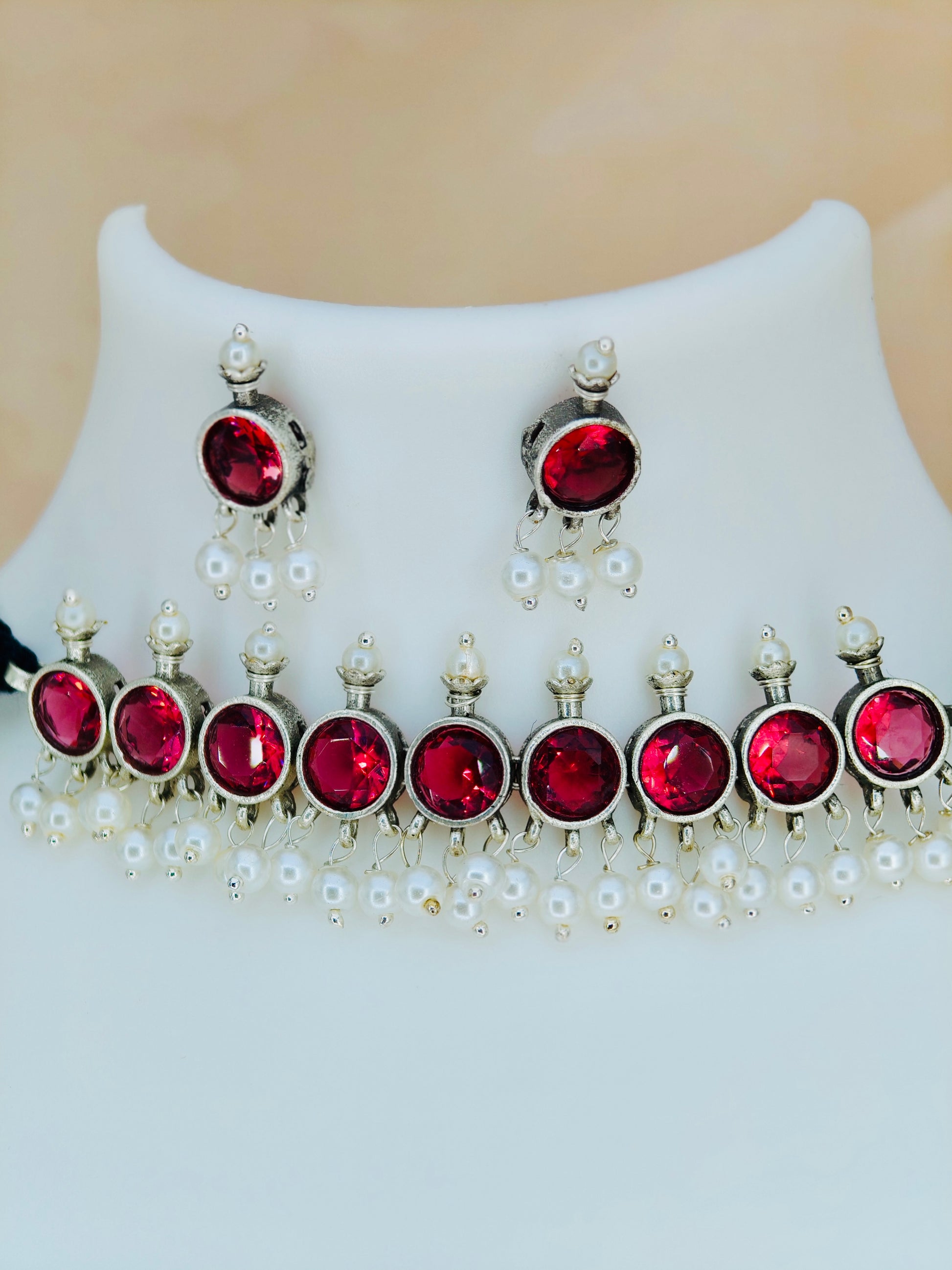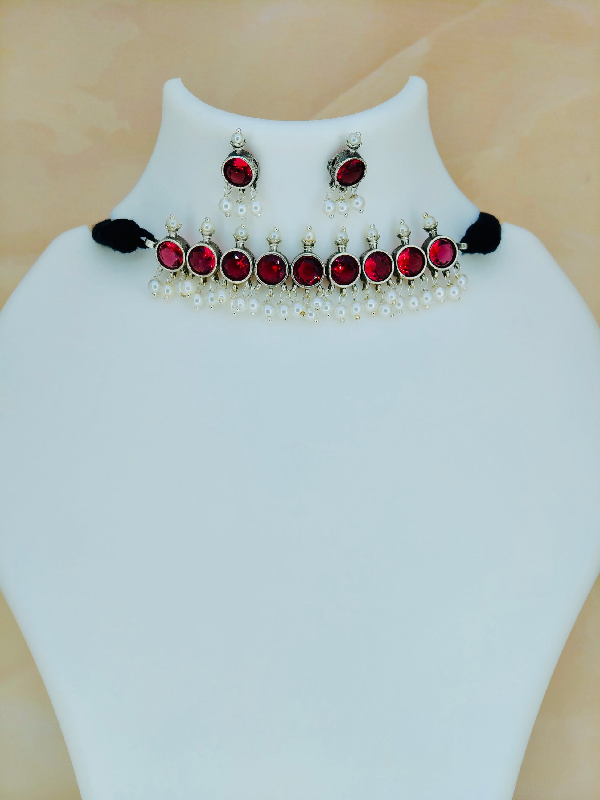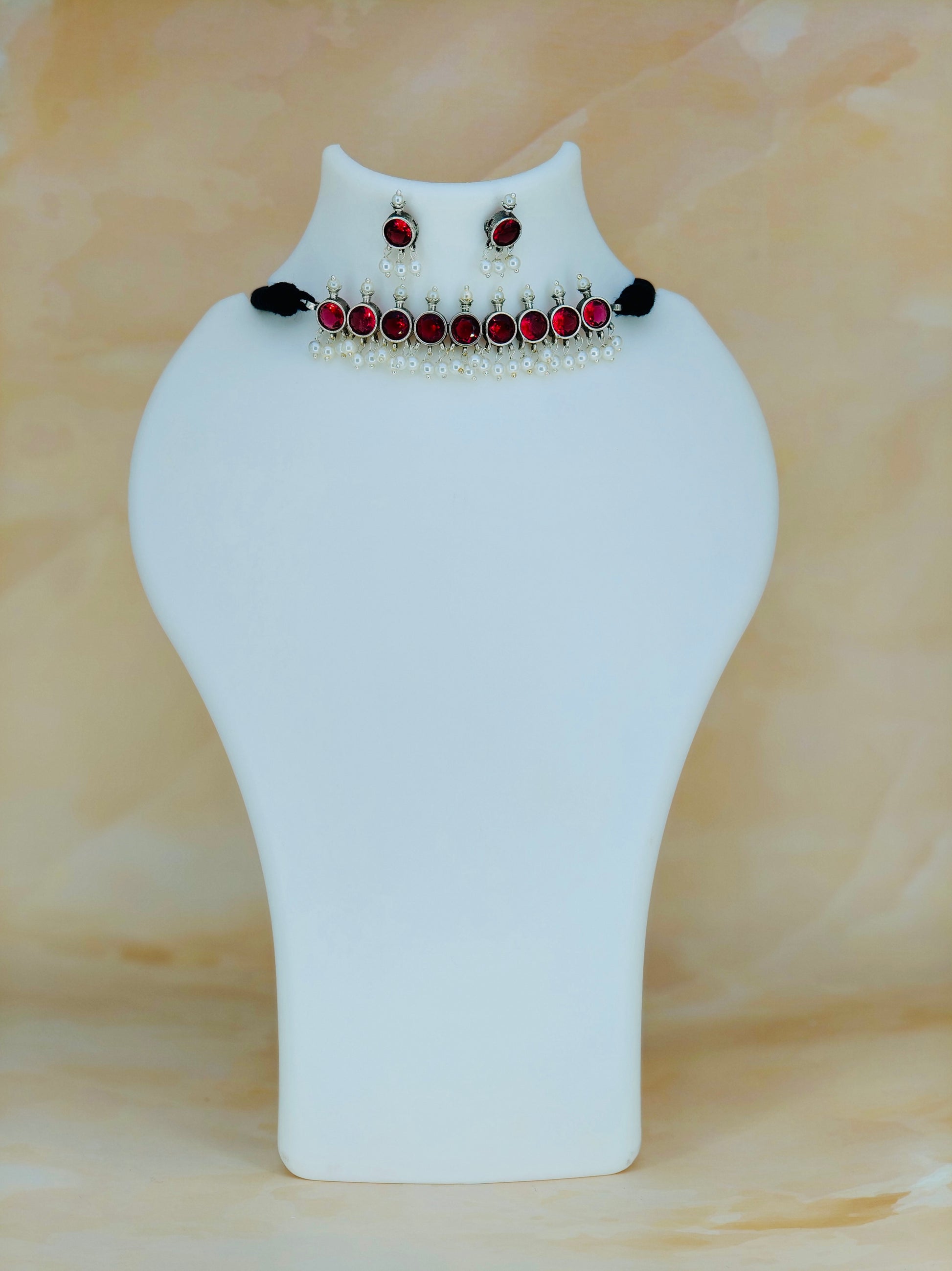 Elevate your jewelry collection with this Beautiful Oxidised Ruby Choker. Expertly crafted with a vintage oxidised finish, it highlights deep red ruby accents that add timeless elegance. The choker’s intricate design offers both sophistication and versatility, perfect for enhancing traditional and contemporary outfits alike. Durable and comfortable to wear, this piece makes a refined statement for special occasions or everyday charm.