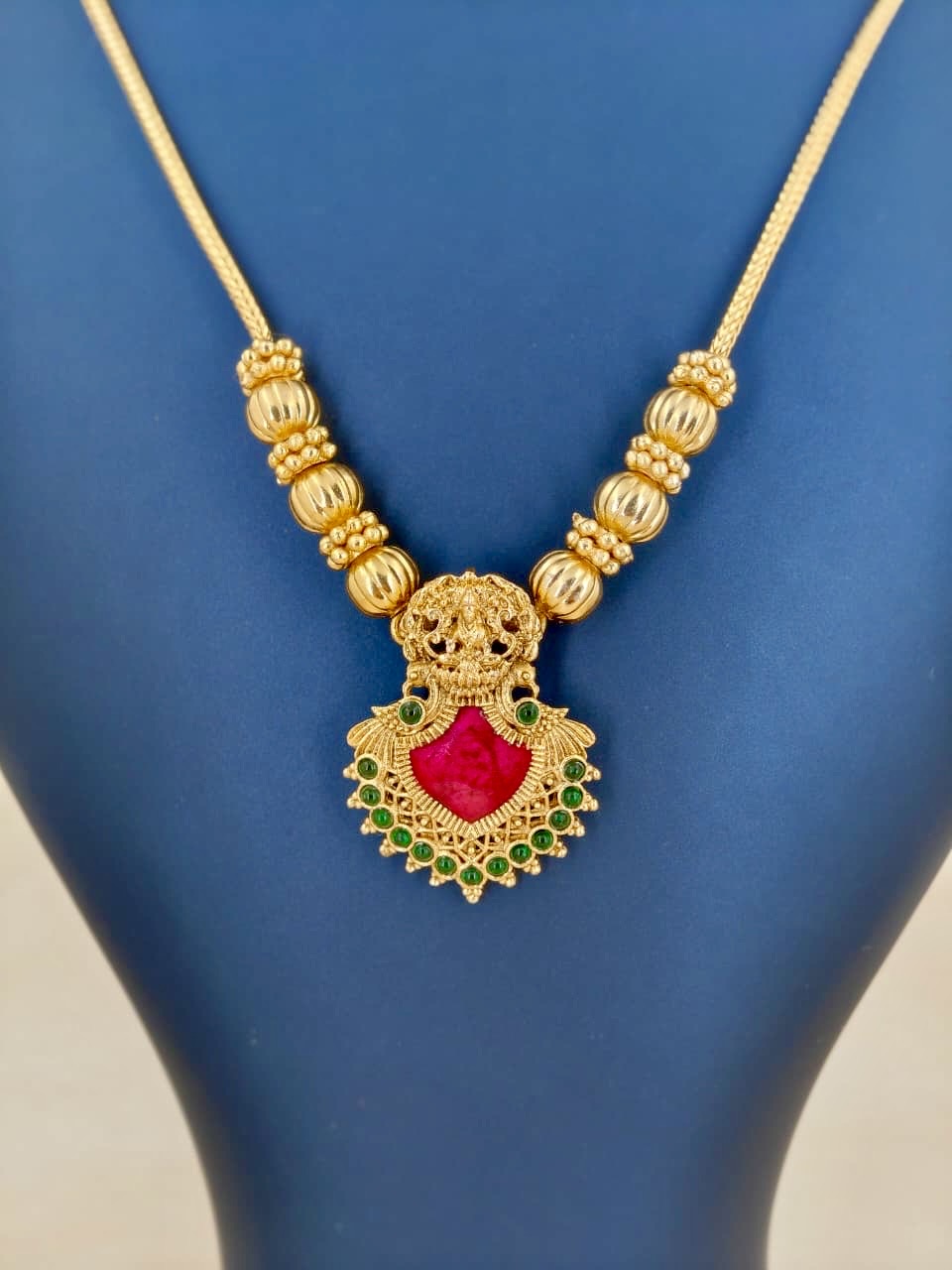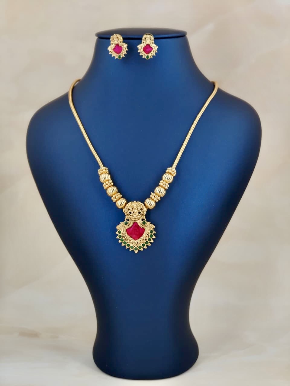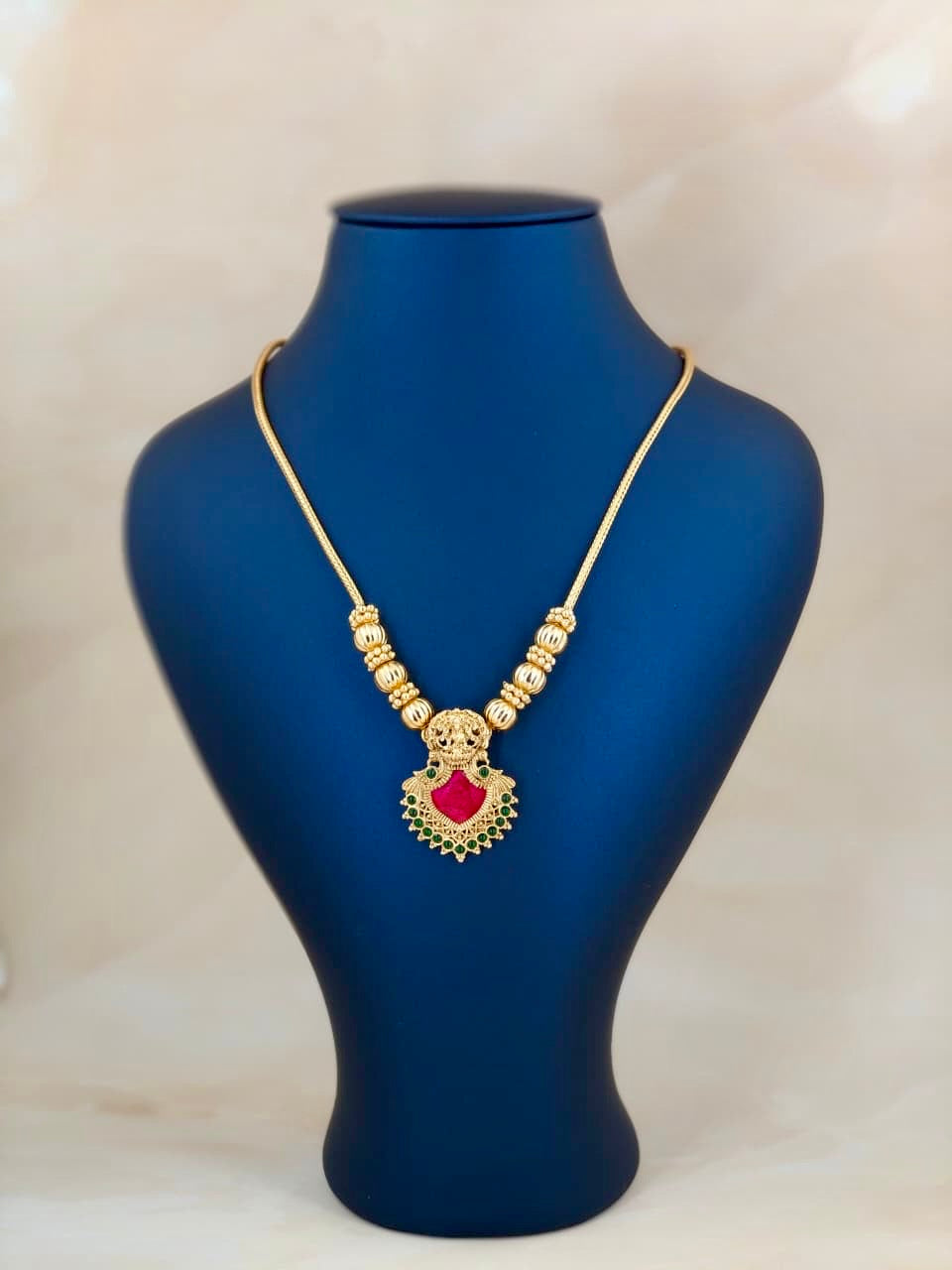 The Single Palakka Pendant Necklace in Rani Pink showcases traditional craftsmanship with a modern touch. Featuring a striking palakka pendant in vibrant rani pink, this necklace adds a refined pop of color to any outfit. Designed to offer both elegance and versatility, it complements both casual and formal attire, making it a timeless addition to your jewelry collection. Crafted to highlight intricate detailing, this piece reflects expert artistry and enduring style.