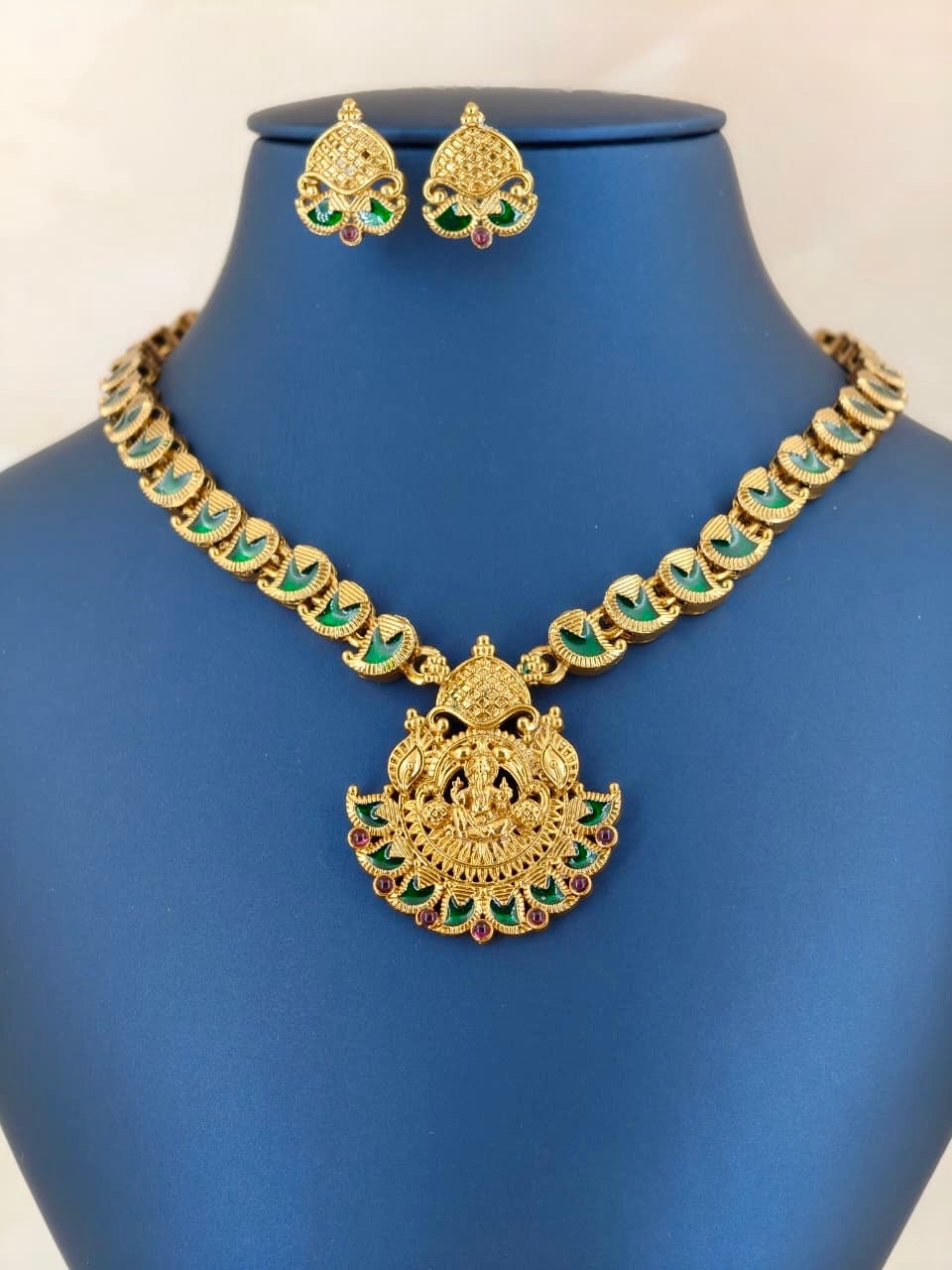 This Ganesha Pendant Enamel Necklace in green features a finely crafted pendant symbolizing wisdom and prosperity. The vibrant enamel finish enhances its intricate design, making it a meaningful accessory with cultural significance. Ideal for daily wear or special occasions, it offers both spiritual connection and elegant style.