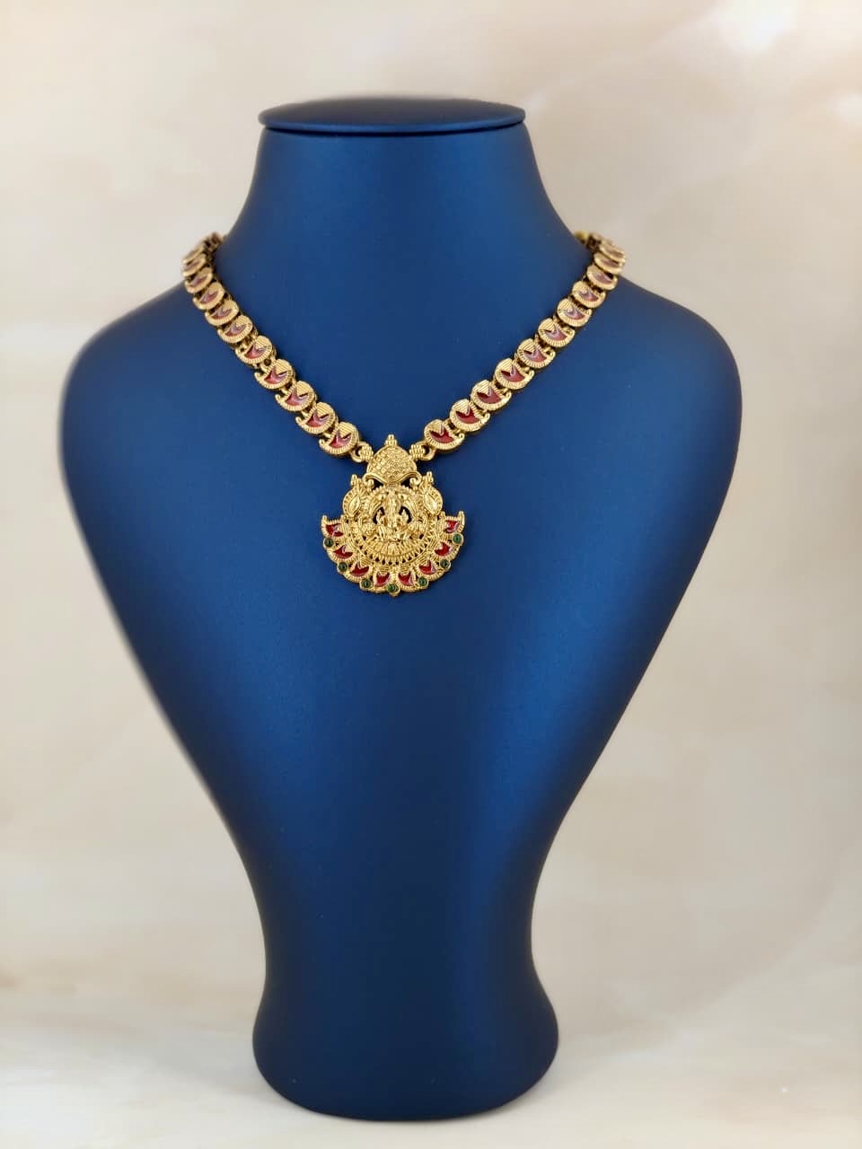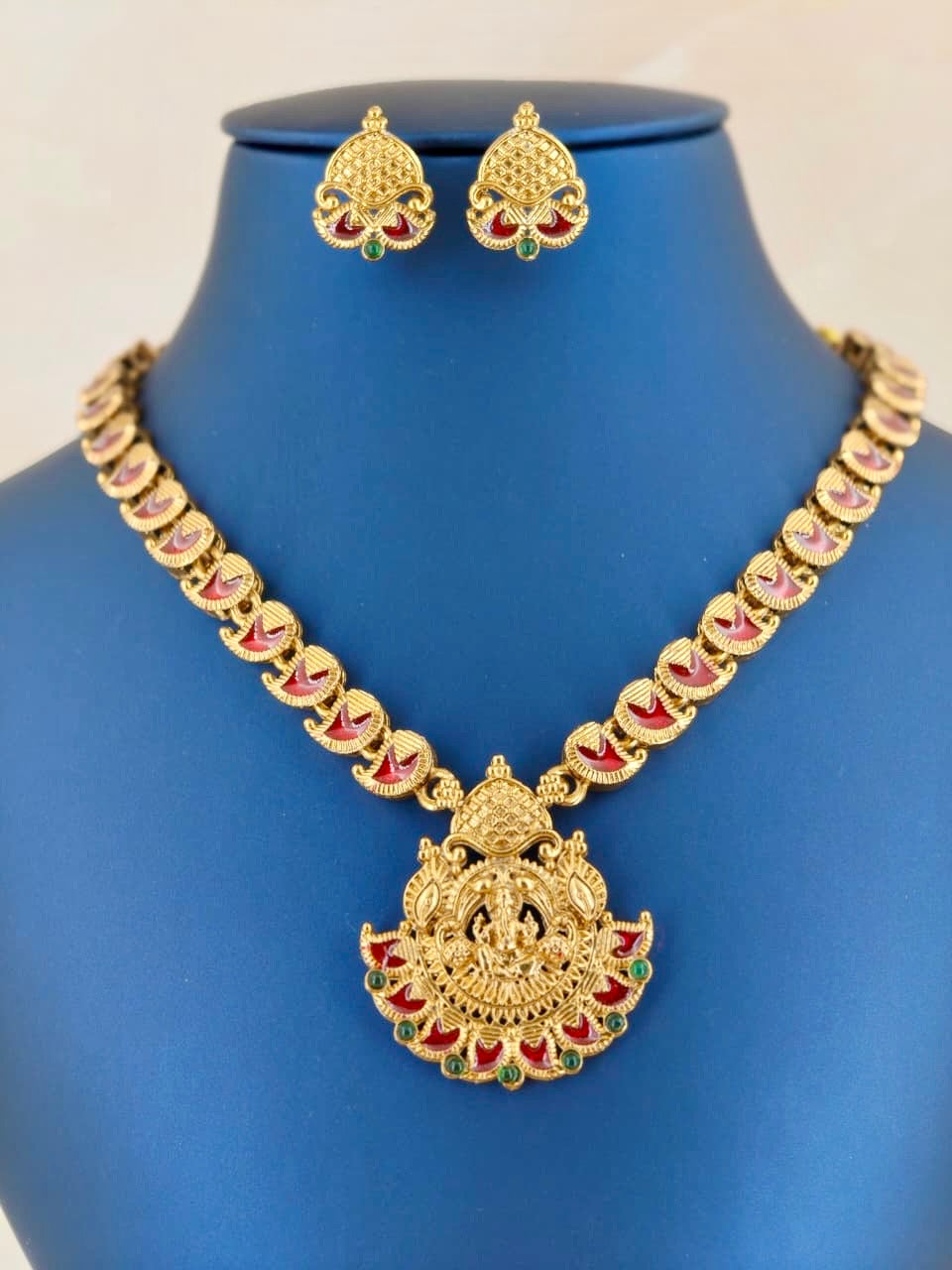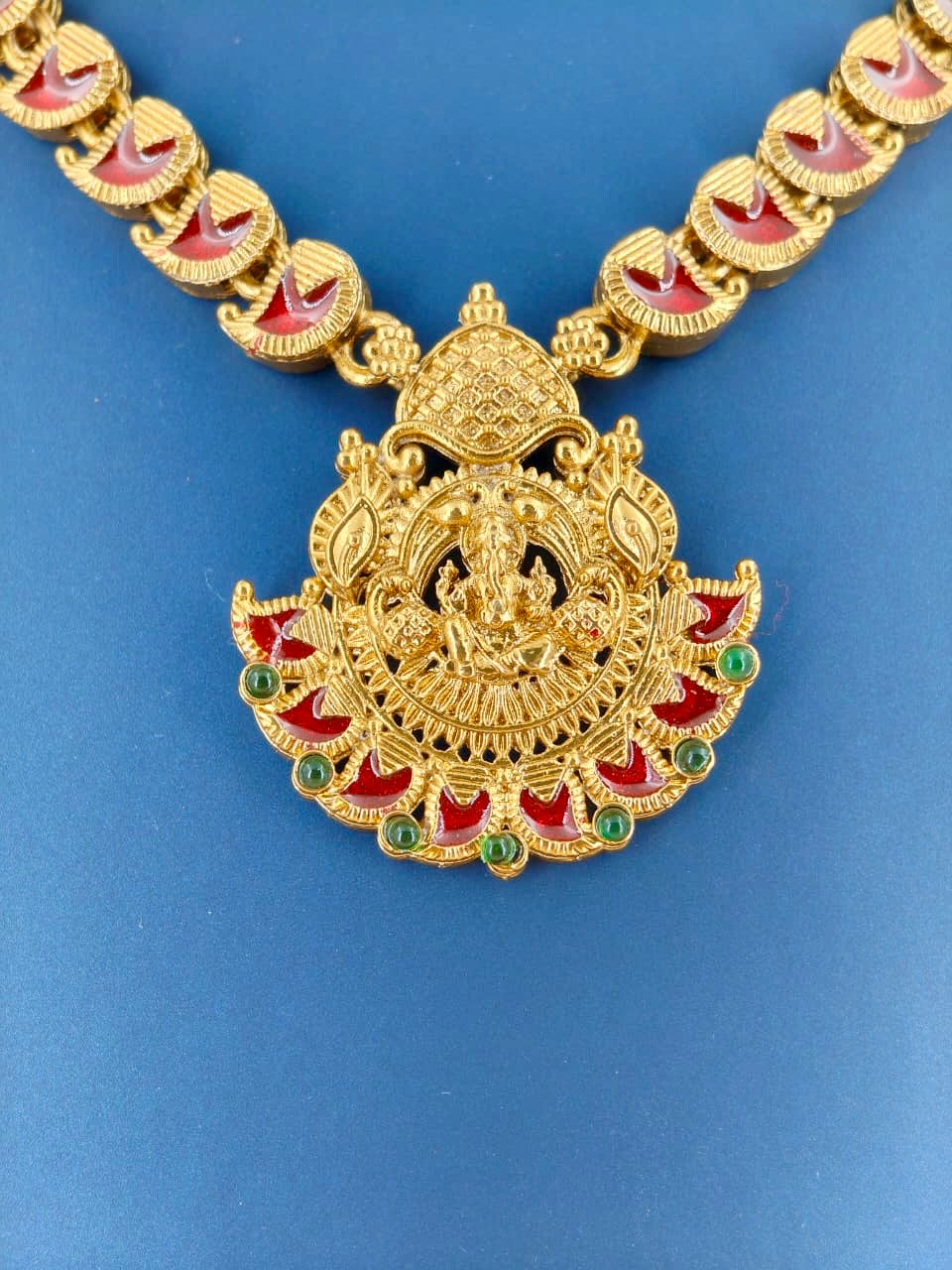 The Ganesha Pendant Enamel Necklace in red showcases intricate craftsmanship with vibrant enamel detailing symbolizing wisdom and prosperity. This expertly designed piece combines traditional spirituality with contemporary style, making it an ideal accessory for everyday wear or special occasions, offering both aesthetic appeal and cultural significance.